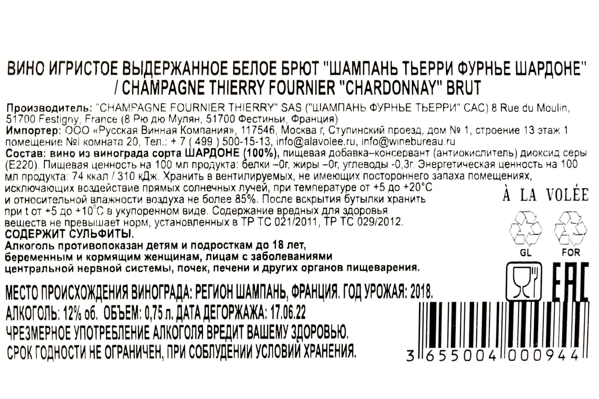 Белое сухое шампанское Thierry Fournier Chardonnay Brut 0,75 л содержит в составе один сорт винограда с участков Шампани — известного региона Франции. Плантации винодельни, выпустившей напиток, располагаются в коммуне Фестиньи, где преобладают глинистые и меловые почвенные отложения. Изготовление в соответствии с аутентичной технологией шампенуаз протекало под постоянным контролем специалистов компании.