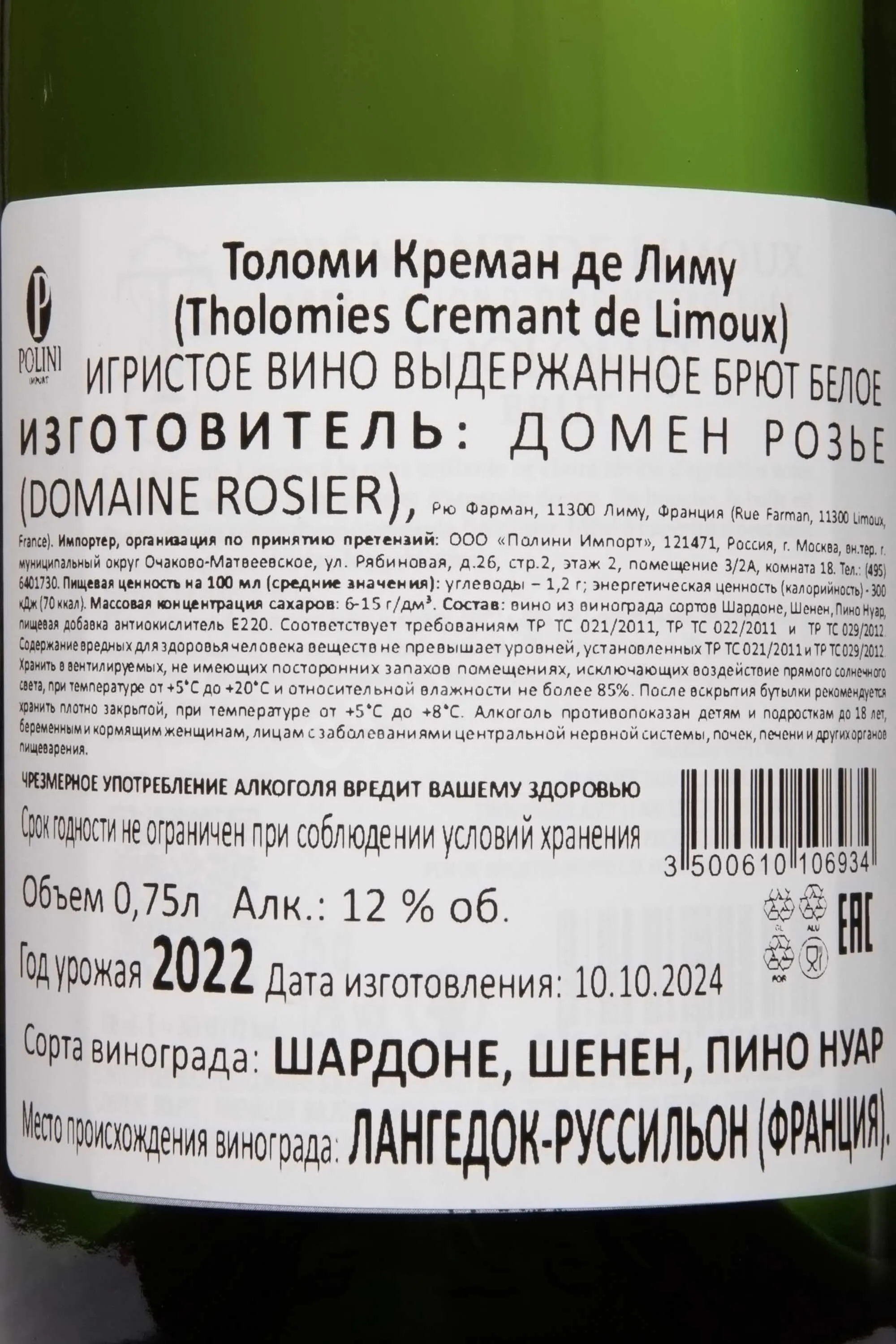 Белое сухое игристое вино Tholomies Cremant de Limoux 2023 г. 0,75 л — 12-градусный брют производства французской винодельческой области Лангедок-Руссильон, обладающий составом из трех виноградных вариаций (двух белых и одной красной) ограниченного периода урожая. Изготовление прошло в соответствии с аутентичным методом бутылочной шампанизации, то есть по завершении ферментации в стальных баках вино подверглось вторичному сбраживанию в бутылках. Еще напиток около года вызревал на осадке. Его упаковка — светлая коробка с логотипом хозяйства-изготовителя, помещенным на фронтальную часть бокса.