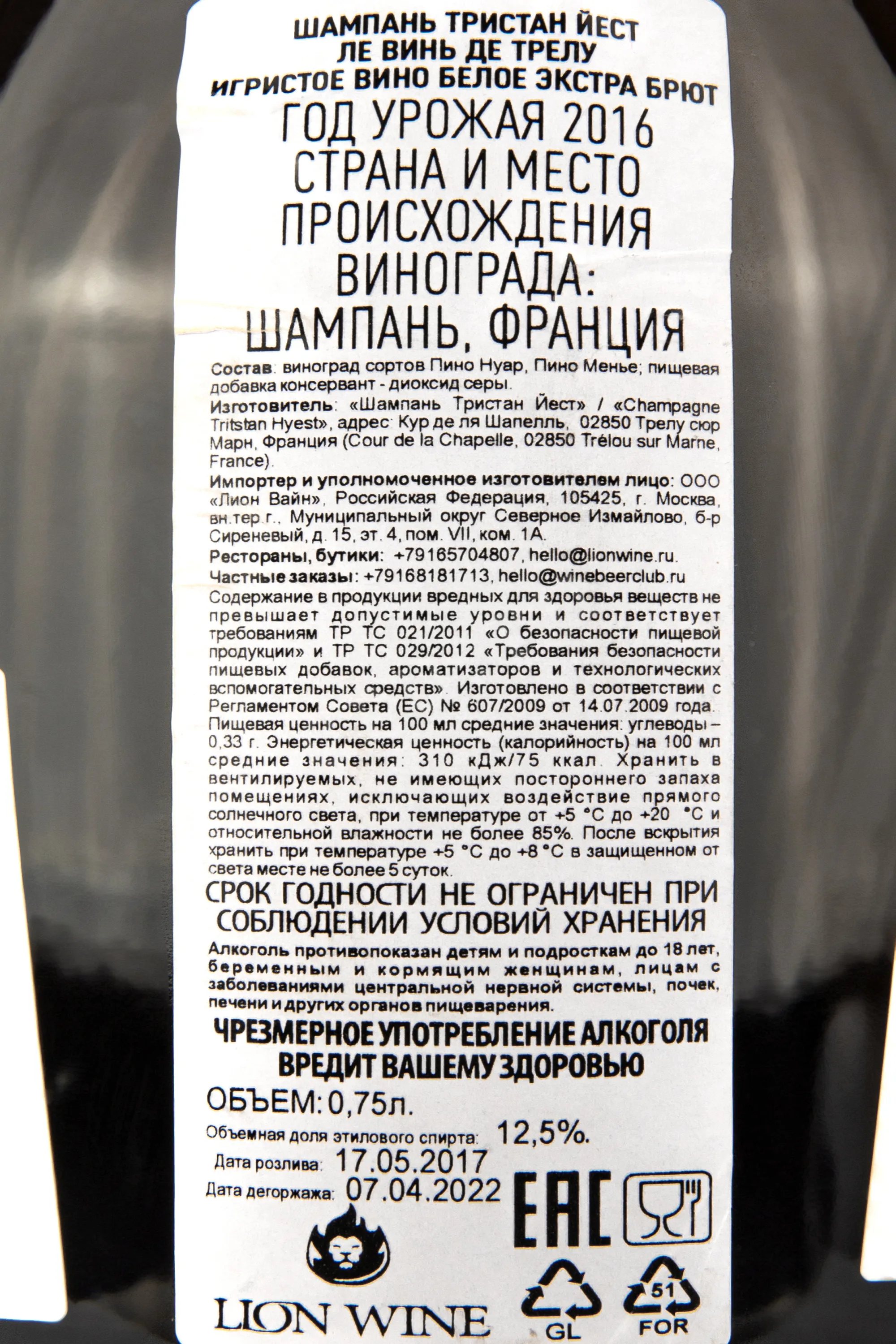 Tristan Hyest Le Vignes de Trelou 0.75 л купить - шампанское Тристан Йест Ле Винь де Трелу цена в магазине КРЮ ПРОФИ г. Москва, ул. Профсоюзная, д. 16/10 10:00-22:00 Ежедневно +7 (495) 920-20-02 info@cru.ru