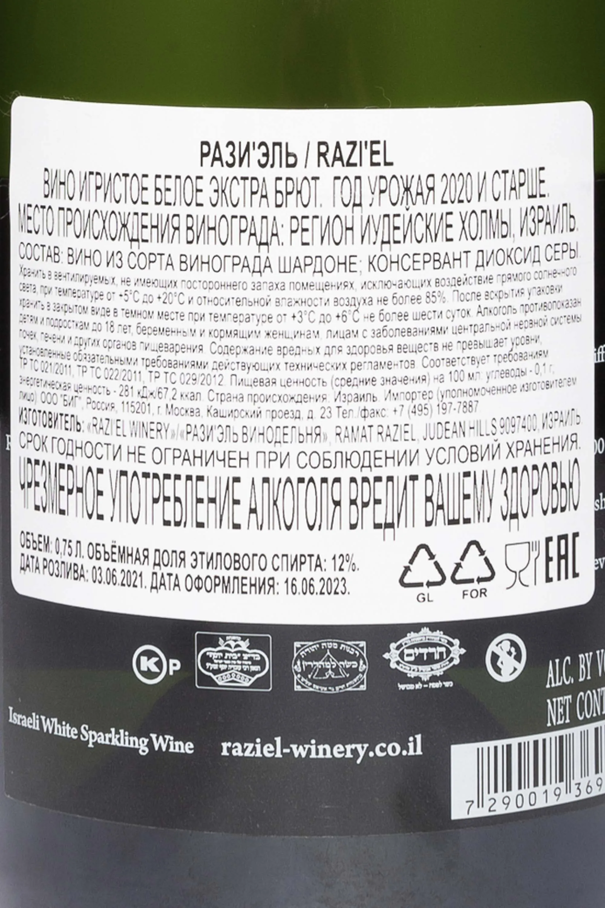 Игристое вино Razi'el Blanc в подарочной упаковке 2020 года 0,75 л — изысканный экстра брют, созданный в Иудейских горах Израиля. Терруар региона сочетает известняковые почвы и прохладные ночи, что обеспечивает сорту Шардоне высокую кислотность и чистоту вкуса. Урожай 2020 года был удачным: умеренно жаркое лето обеспечило равномерное созревание и насыщенность аромата. Виноградное сусло проходило ферментацию в 600-литровых французских дубовых бочках, за счет чего базовое вино приобрело тонкие кремовые ноты. Затем оно выдерживалось осадке 6 месяцев, что придало ему текстуру и глубину. Вторичная ферментация проходила по традиционному методу шампенуаз без добавления дозажного ликера, создавая естественную сухость и гармонию. После этого брют выдерживался в бутылках 2 года. Рази'эль Блан признан критиками за чистоту стиля, баланс и точность исполнения. Игристое вино производится с соблюдением всех правил Кашрута и является кошерным.