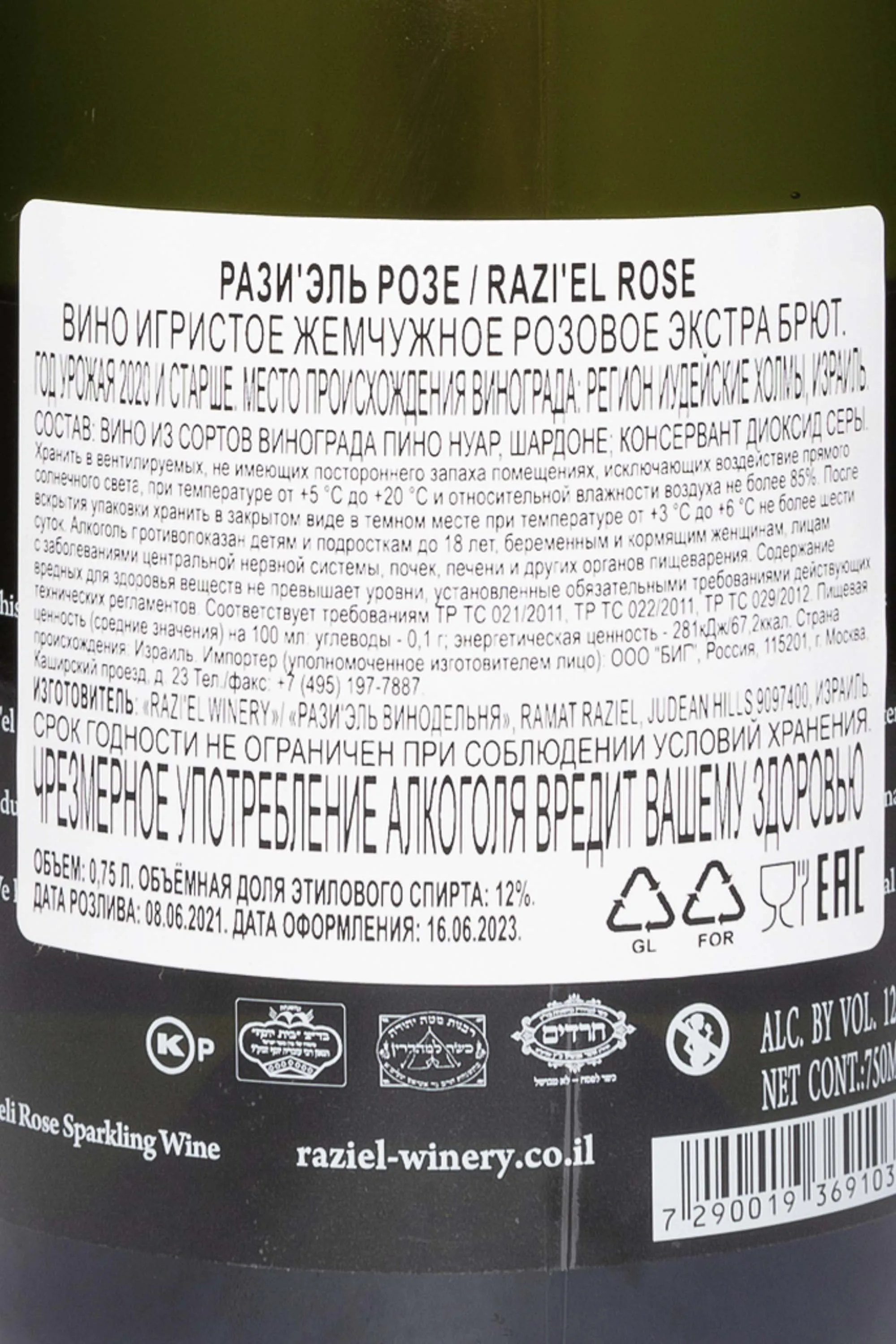 Игристое вино Razi'el Rose в подарочной упаковке 2020 года 0,75 л — это изысканный розовый экстра брют, созданный в Иудейских холмах по классическому шампанскому методу. Виноград сортов Пино Нуар и Шардоне выращен на высоте около 700 метров над уровнем моря. Почвы терра россa богаты известняком и минералами, что придает напитку минеральную свежесть. Климат региона средиземноморский: теплое лето и прохладная зима способствуют медленному созреванию ягод и формируют баланс кислотности. Первичная ферментация проходила в дубовых бочках объемом 600 литров, после чего базовое вино выдерживали на осадке шесть месяцев. Вторичное брожение в бутылке и последующая выдержка в течение двух лет придали напитку сложность и тонкий перляж. Это игристое розе произведено с соблюдением кашрута и относится к категории кошерных вин.