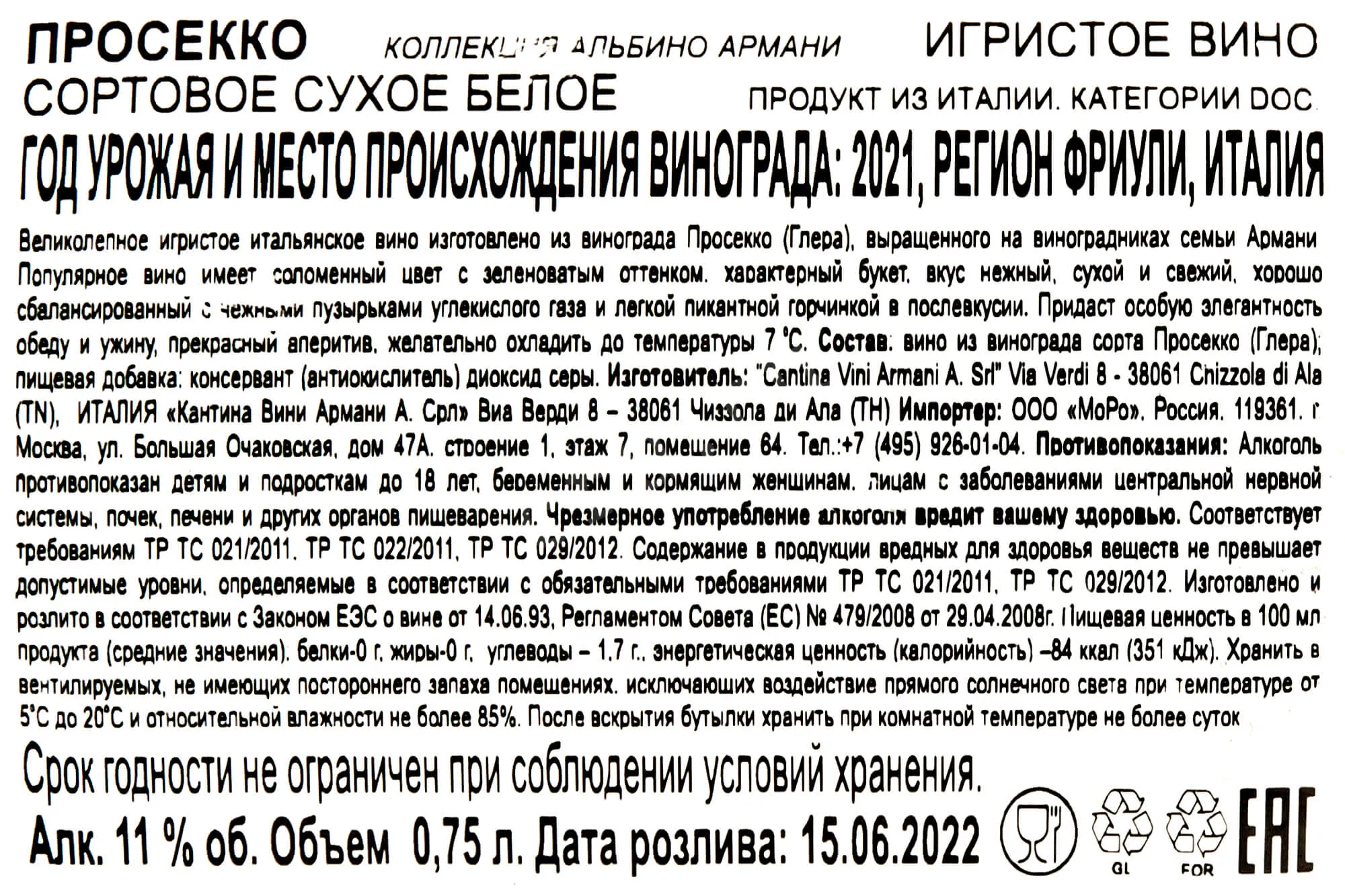 Игристое вино Albino Armani Prosecco 0,75 л. – великолепное Просекко сорта брют, полученное из винограда, выращиваемого на плантациях винодельческого региона Фриули-Венеция-Джулия, в местности под наименованием «Грейв», защищенной Альпами. Каменистая и рыхлая почва, значительные перепады температур и вентилируемый микроклимат наделяют виноград уникальными характеристиками. После изготовления кюве осуществляется вторичная длительная ферментация в резервуарах высокого давления (по методу Шарма) для получения особенно нежного и сливочного перляжа. В период с 2019 по 2023 год Просекко от Альбино Армани завоевало множество наград на престижных международных выставках.