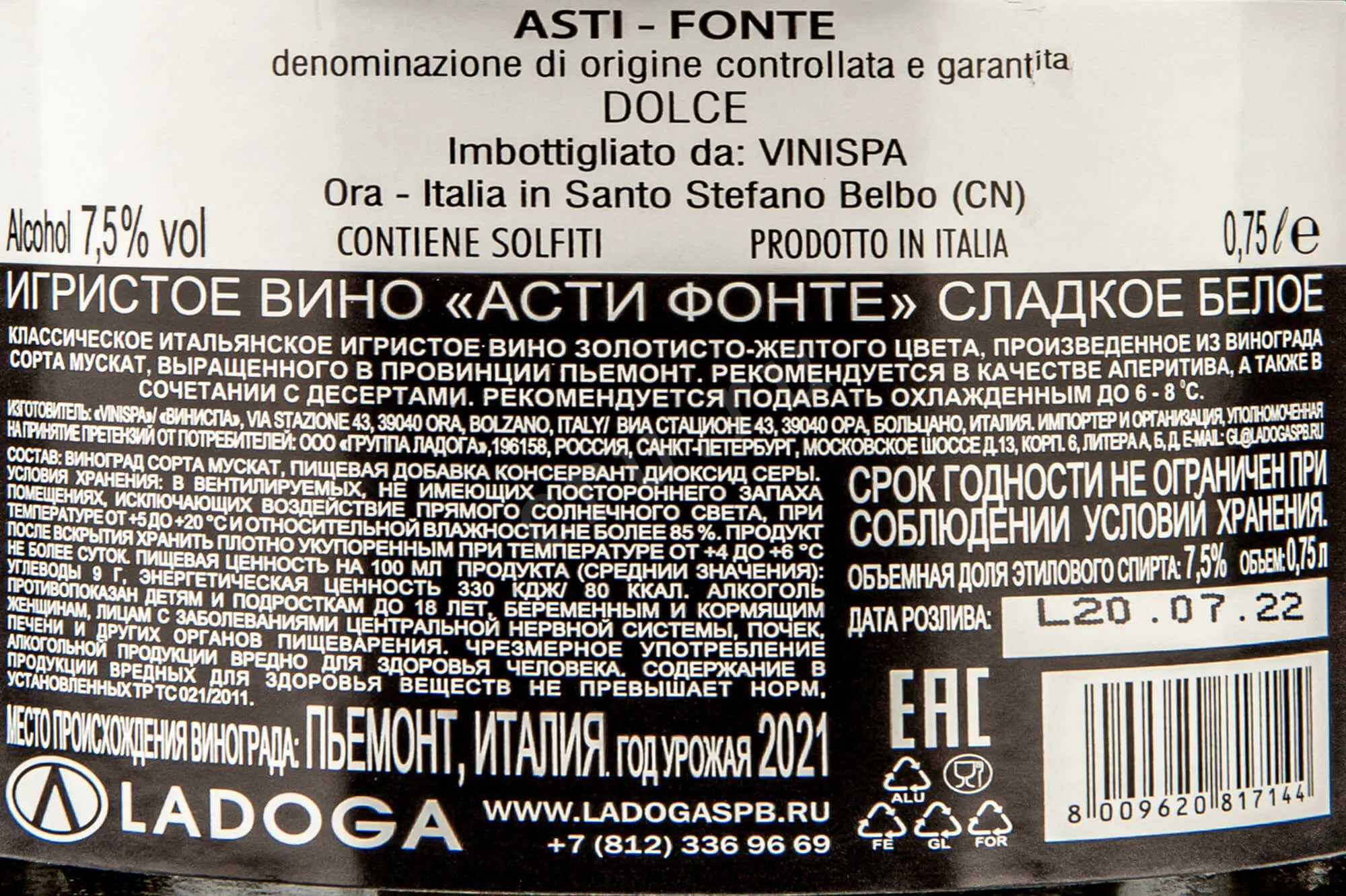 Asti Fonte DOCG 2023 0.75 л купить - Итальянское игристое вино Асти Фонте ДОКГ цена в магазине КРЮ ПРОФИ г. Москва, ул. Профсоюзная, д. 16/10 10:00-22:00 Ежедневно +7 (495) 920-20-02 info@cru.ru