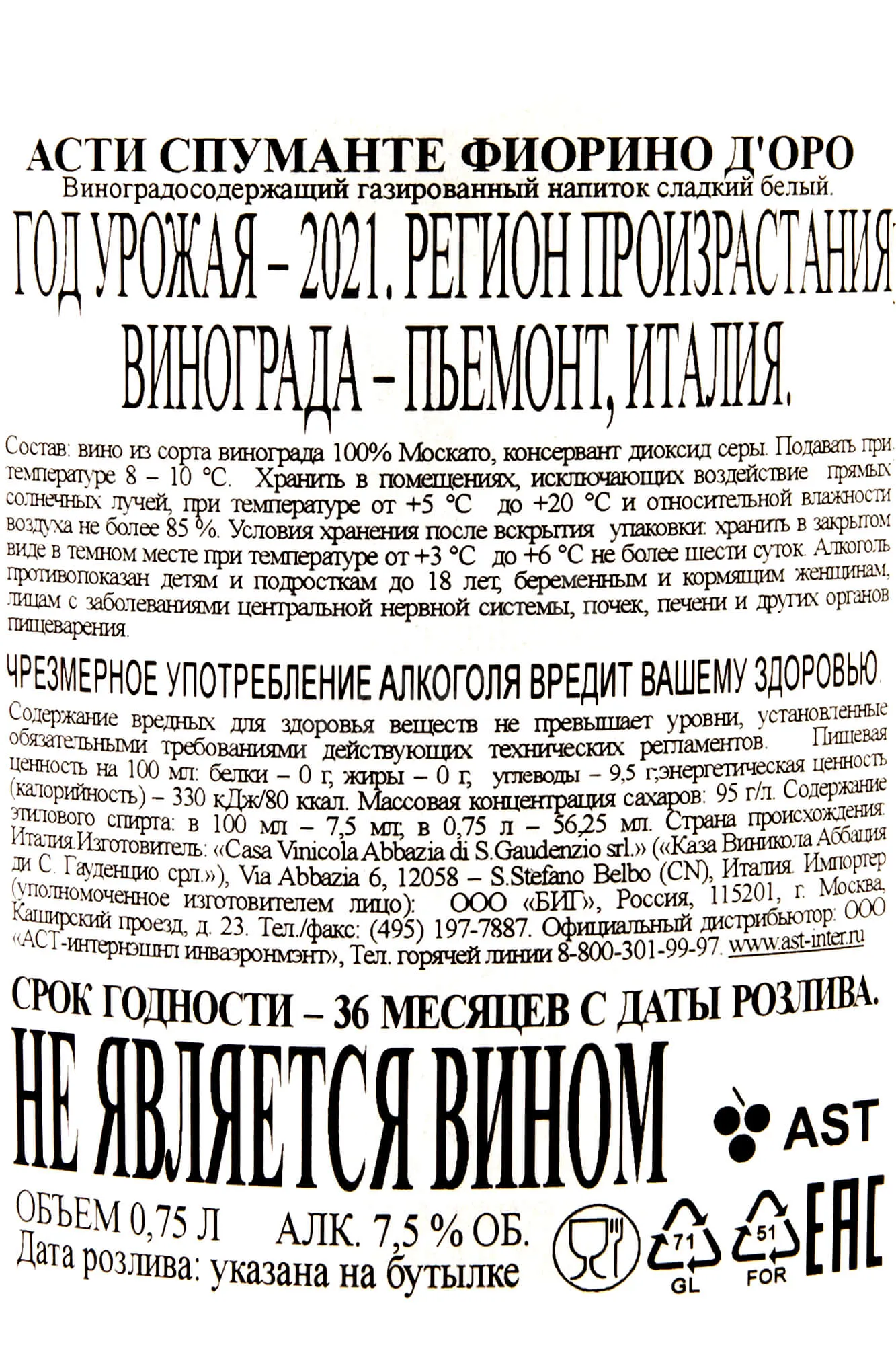 Asti Spumante Fiorino d'Oro Abbazia DOCG 2022 0.75 л купить - Итальянское игристое вино Асти Спуманте Фиорино д`Оро Аббация ДОКГ цена в магазине КРЮ ПРОФИ г. Москва, ул. Профсоюзная, д. 16/10 10:00-22:00 Ежедневно +7 (495) 920-20-02 info@cru.ru
