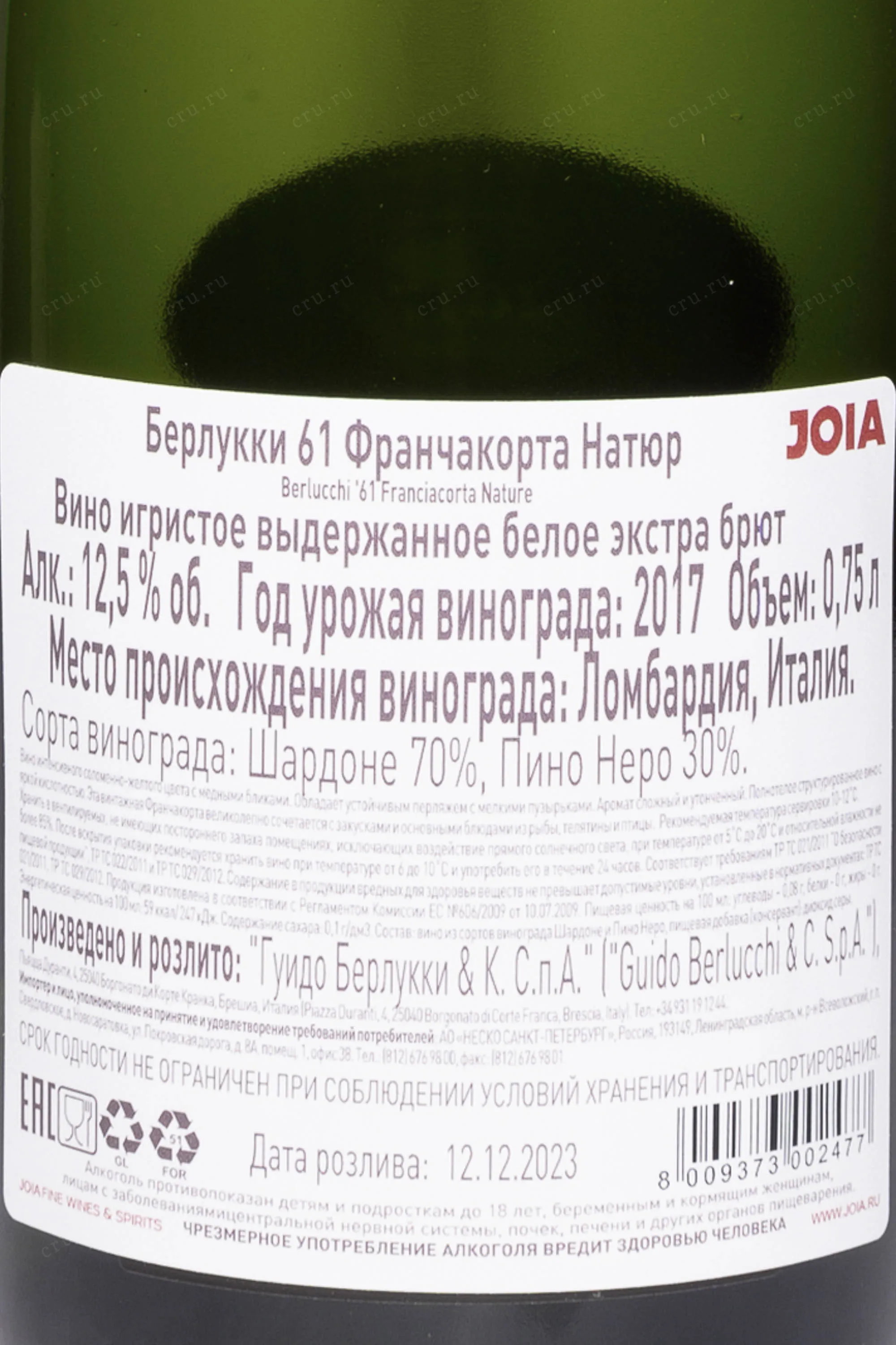 Игристое вино Berlucchi 61 Franciacorta Nature в подарочной упаковке 2017 года 0,75 л — это утонченный итальянский белый экстра брют, отражающий стиль Франчакорты в его естественной чистоте. Виноград выращен в провинции Брешиа, в регионе Ломбардия, где известняковые почвы и прохладный климат создают идеальные условия для сортов Шардоне и Пино Неро. Первичное брожение частично проходит в дубовых бочках, где вино набирает округлость и сложность. Вторичная ферментация протекает по классическому методу в бутылке, после чего напиток выдерживается на осадке не менее 60 месяцев. Отсутствие дозажа после дегоржажа подчеркивает природную свежесть и минеральность этого игристого вина. Berlucchi 61 Nature входит в историческую линейку, созданную в честь первой Франчакорты 1961 года, и неоднократно получало высокие оценки от международных критиков за элегантность и чистоту вкуса.