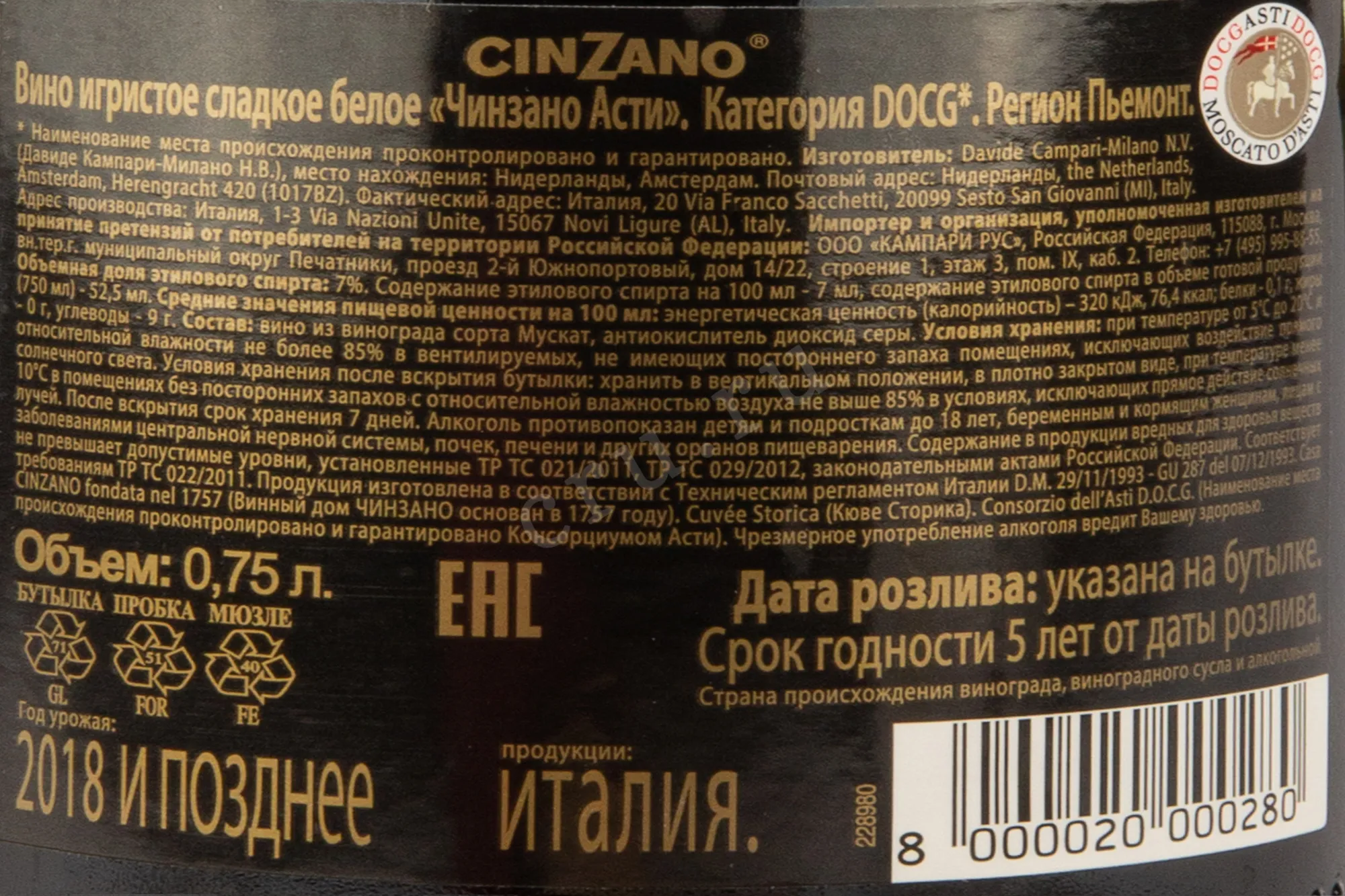 Cinzano Asti 0.75 л купить - Итальянское игристое вино Чинзано Асти цена в магазине КРЮ ПРОФИ г. Москва, ул. Профсоюзная, д. 16/10 10:00-22:00 Ежедневно +7 (495) 920-20-02 info@cru.ru