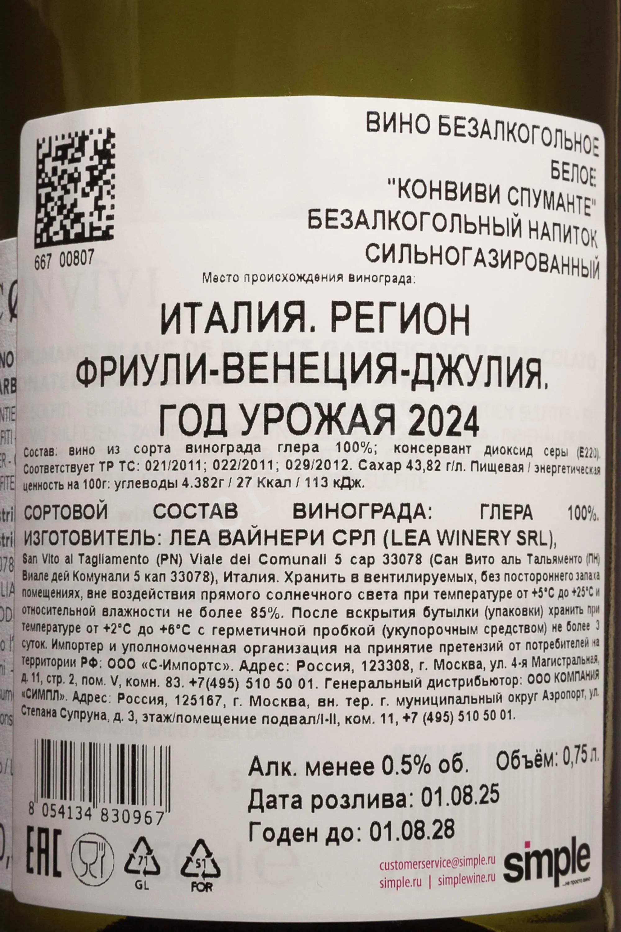 Игристое вино Convivi Spumante Blanc De Blancs Dealcoholized 2024 года 0,75 л — безалкогольное, выполнено в современном стиле. Оно ориентировано на легкость и чистоту вкуса. Виноград был выращен в итальянском регионе Фриули-Венеция-Джулия, в зоне с умеренно тёплым климатом. Урожай 2024 года сформировался при стабильной погоде без экстремальной жары, что позволило сохранить кислотность и ароматический потенциал ягод. Производство включало классическую винификацию с ферментацией по методу Шарма, после чего алкоголь аккуратно удалили щадящим технологическим методом. Выдержка в стальных резервуарах была недолгой и направлена на сохранение свежести. Уникальность вина заключается в сочетании классического формата Blanc de Blancs и деалкоголизированного стиля. Напиток сохраняет характер игристого вина и подходит для широкой аудитории.
