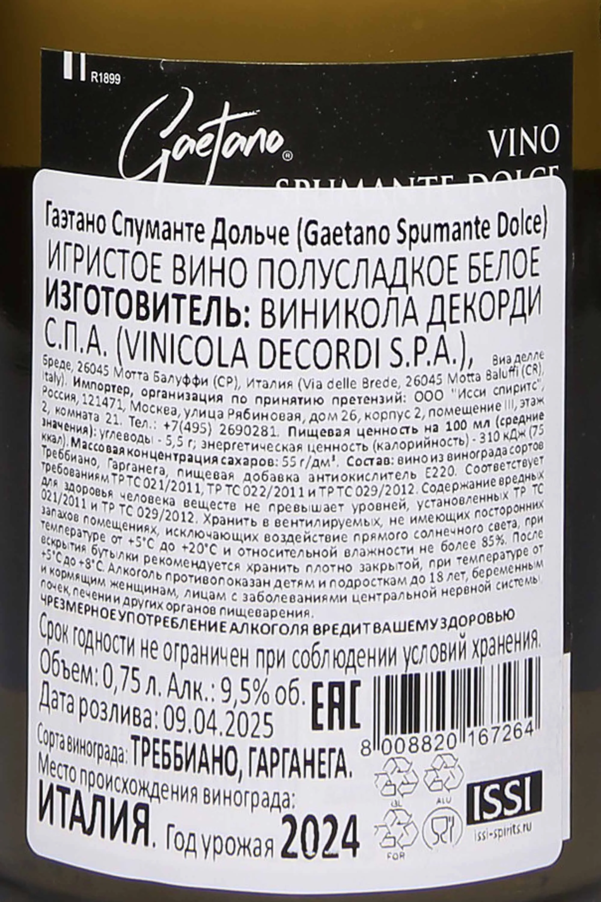 Игристое вино Gaetano Spumante Dolce 2024 0.75 л