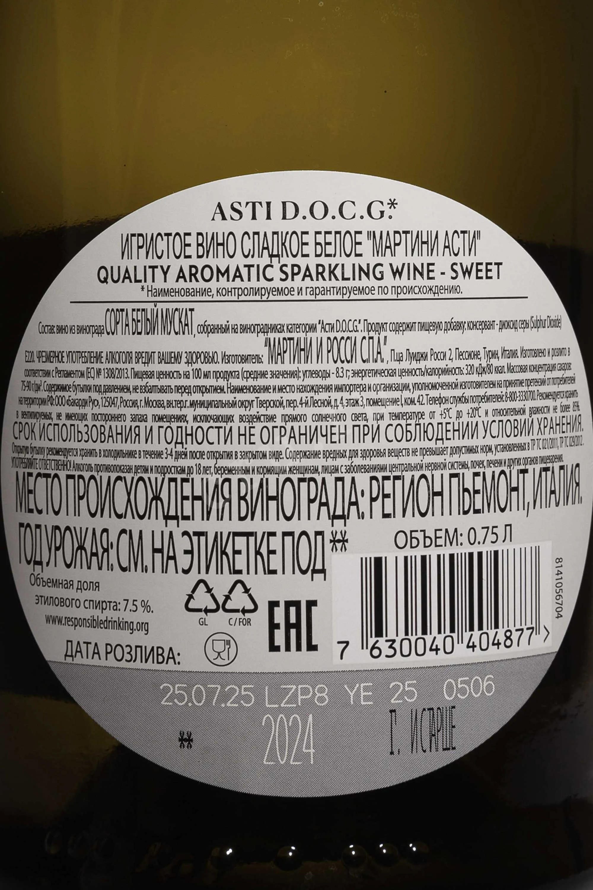Игристое белое сладкое вино Martini Asti 0,75 л – восхитительная вариация, которая подойдет на роль спиртного в праздничный и будний день. Она создана из винограда сорта Мускат, являющийся одним из главных сортов на пьемонтских виноградниках. Ягоды, собранные при оптимальной спелости, дают напиток с ярким и выразительным профилем. Приятный кремовый перляж вину придает повторная ферментация, в процессе которой сусло проходит процесс шампанизации – насыщения пузырьками углекислоты.
