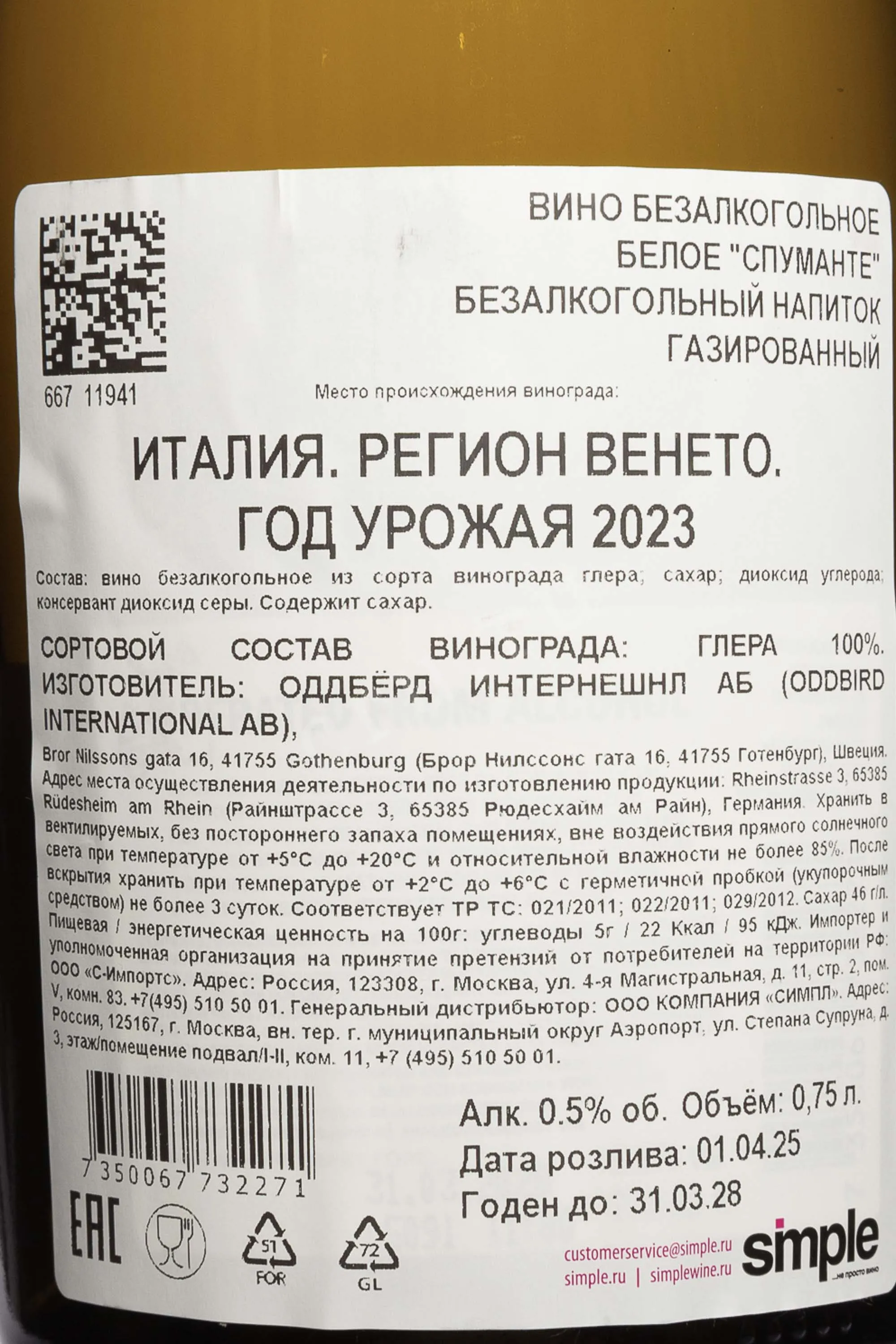 Игристое вино Oddbird Alcohol-free Spumante 2023 0.75 л создано по традиционной итальянской методике с бережным исключением алкоголя после полного цикла ферментации. Напиток получили в долинах Венето, где солнечные дни и прохладные ночи обеспечивают идеальное созревание ягод. Для сохранения естественного характера проводилась щадящая деалкоголизация при низкой температуре, что позволяло удержать аромат и текстуру без утраты глубины вкуса. Терруар с известняковыми и глинистыми почвами наполнял напиток минеральными оттенками и тонкой свежестью, а мягкий климат 2023 года подарил ягодам особую гармонию кислотности и фруктовых акцентов.