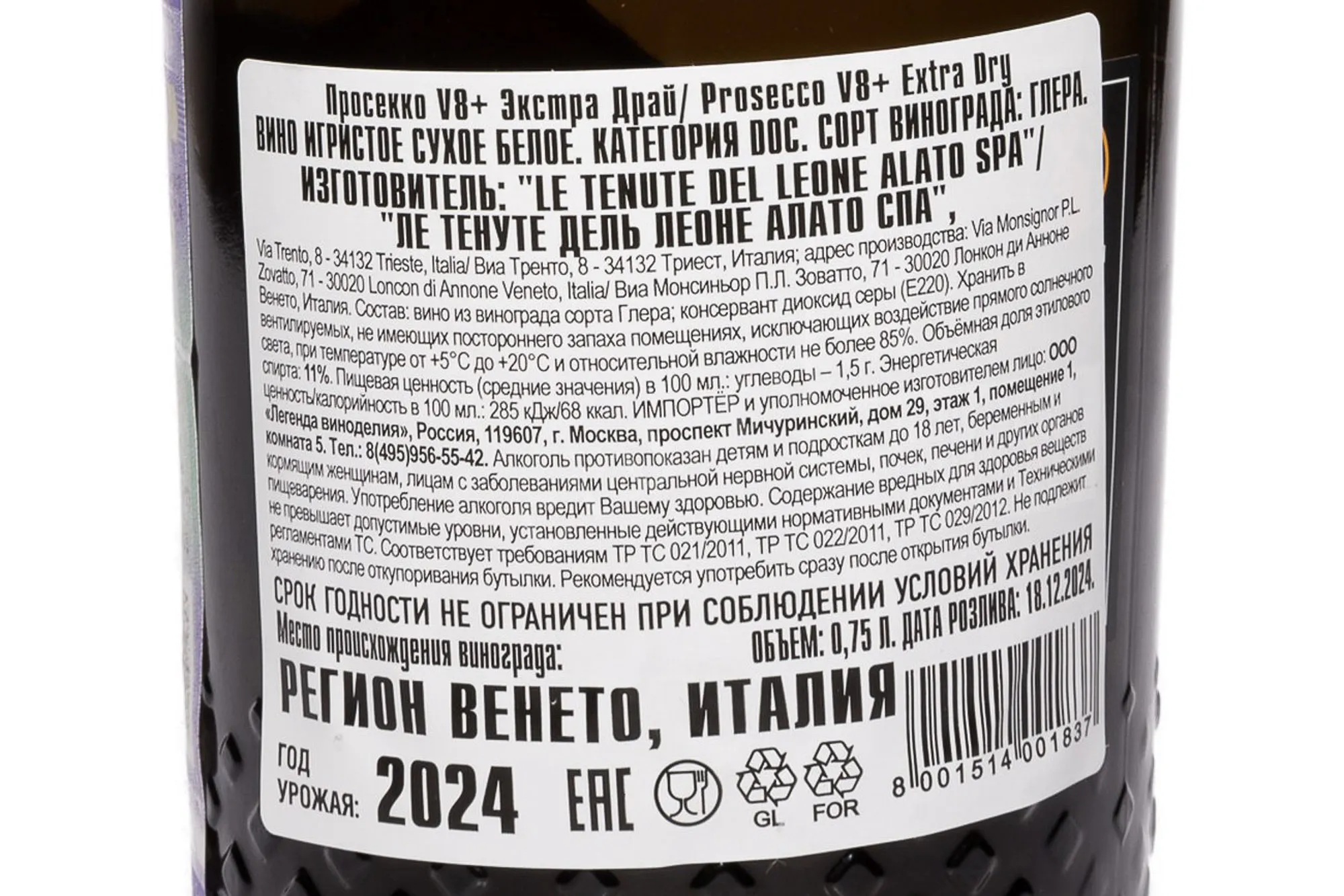 Игристое вино Prosecco V8+ 2024 года 0,75 л создано в лучших традициях региона Вальдоббьядене, где солнечные холмы и минеральные почвы придают букету свежесть и характер. Урожай 2024 года выдался удачным: весна была мягкой, лето — тёплым и сухим, что позволило сорту Глера набрать идеальный баланс сахара и кислотности. Виноград выращивался органическим способом на глинистых склонах, насыщенных камнями. После ручного сбора ягоды проходили мягкое прессование. Первичная ферментация проводилась в нержавеющих резервуарах при контролируемой температуре, что сохранило чистоту аромата. Вторичная ферментация по методу Шарма длилась не менее месяца, что обеспечило напитку устойчивые пузырьки и кремовую текстуру. Восьмерка в названии символизирует бесконечность, отражает идею вечной молодости и солнечной энергии, ведь 8 минут требуется свету, чтобы достичь виноградников Otto Piu.