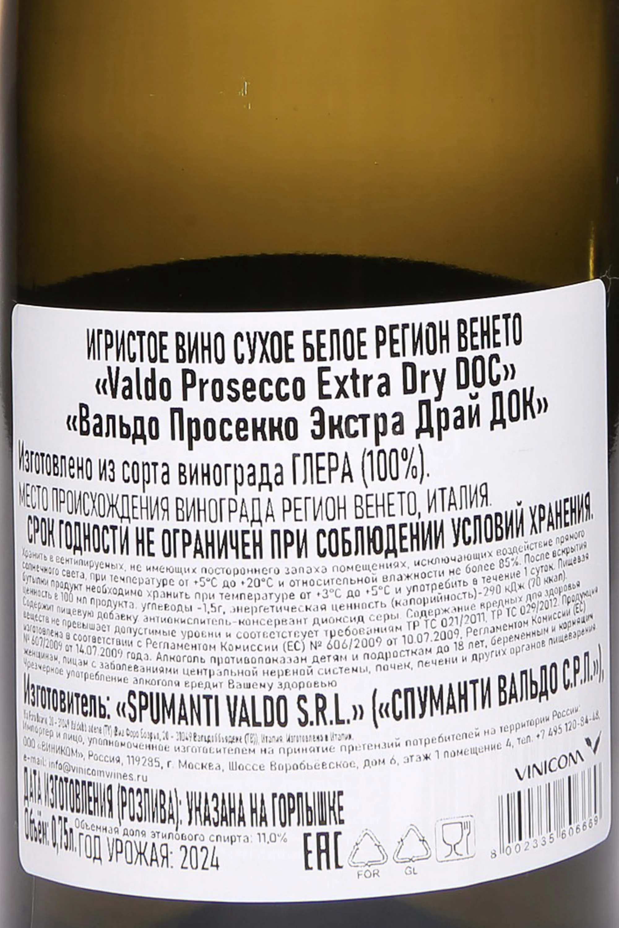 - Сорт винограда: Глера (100%).