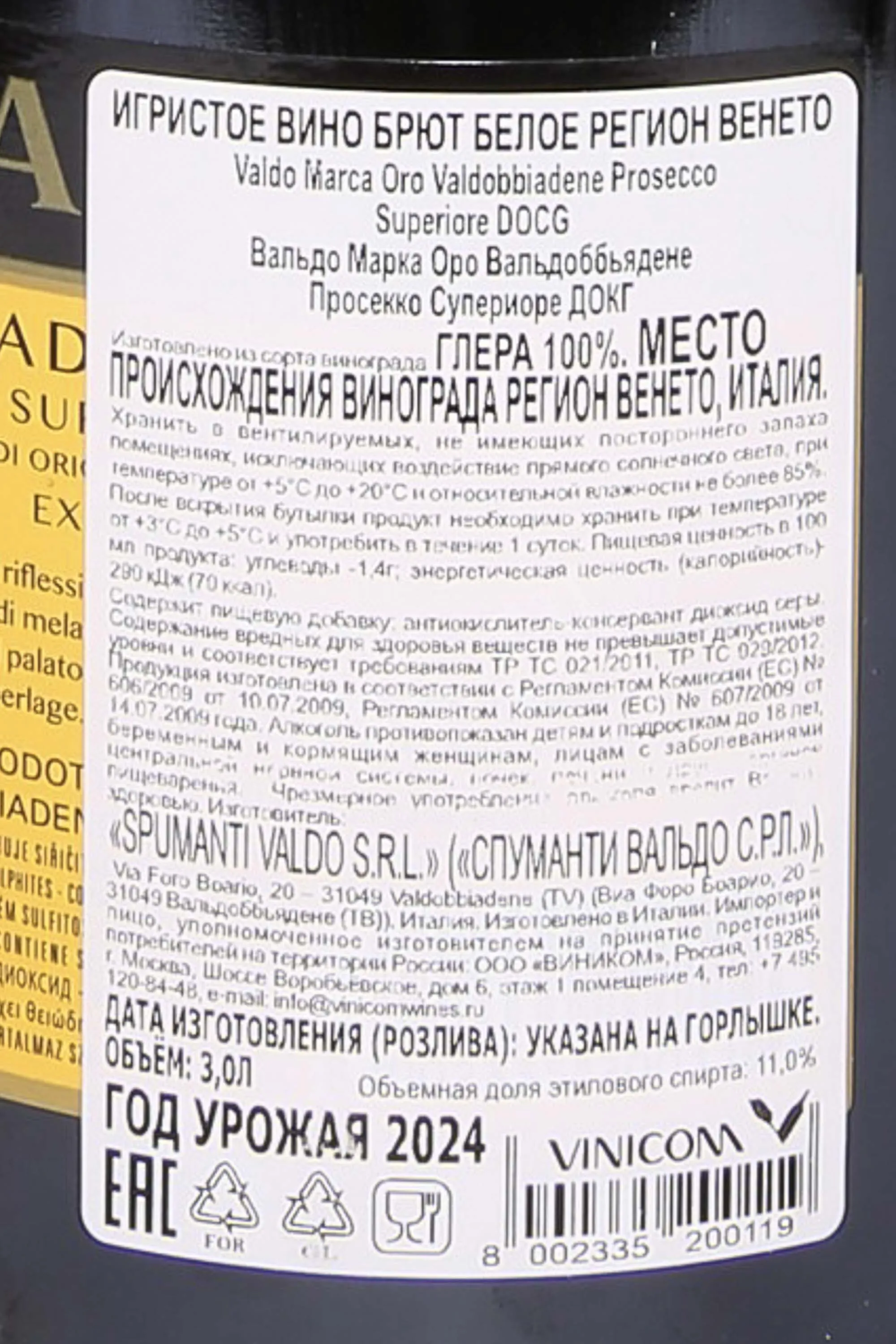 Игристое вино Valdo Marca Oro Valdobbiadene Prosecco Superiore DOCG 2024 года 3 л в, деревянном ящике, создано в сердце региона Венето, где виноградники расположены на холмах Вальдоббьядене. Урожай 2024 года выдался удачным: тёплое лето и умеренные дожди обеспечили ягодам хорошую зрелость и яркий аромат. Для производства использовался метод Шарма, при котором вторичная ферментация проходила в стальных резервуарах, сохранив свежесть и фруктовый характер игристого вина. Выдержка проводилась недолго, что подчеркнуло лёгкость и гармонию стиля. Просекко завоевало медали на конкурсах International Wine & Spirit Competition и Mondiales des Vins. Вариация в большой бутылке обладает коллекционной ценностью и отлично подходит на роль подарка.