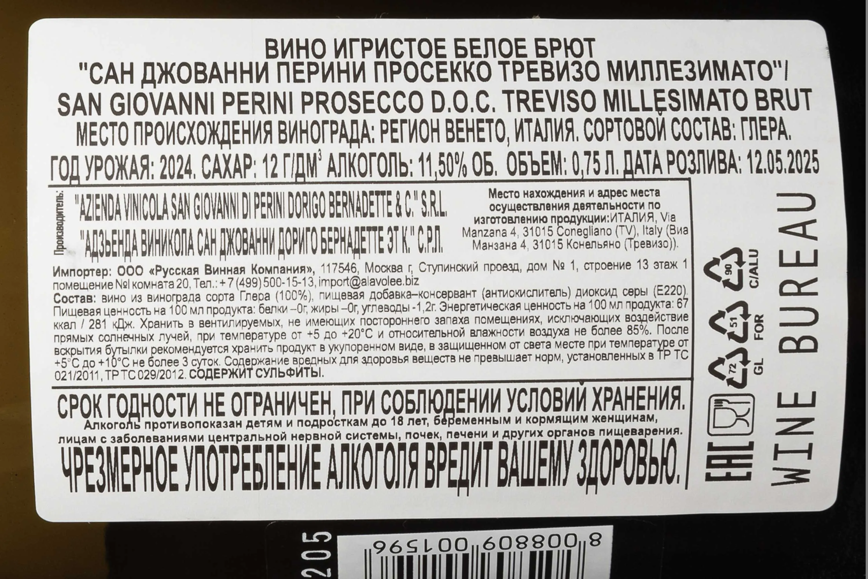 Игристое белое вино San Giovanni Perini Prosecco Millesimato DOC 2024 г. 0,75 л создано в холмистой части Венето, где виноград созревает в мягком климате с постоянным движением воздуха. Производитель использует ручной сбор и бережное прессование, чтобы сохранить природную свежесть сорта. Первичная ферментация проходит при контролируемой температуре, вторичное брожение — в автоклавах по методу Шарма, благодаря чему перляж получается тонким и устойчивым. Миллезимный статус подчёркивает работу с урожаем одного года, отражающим особенности сезона.