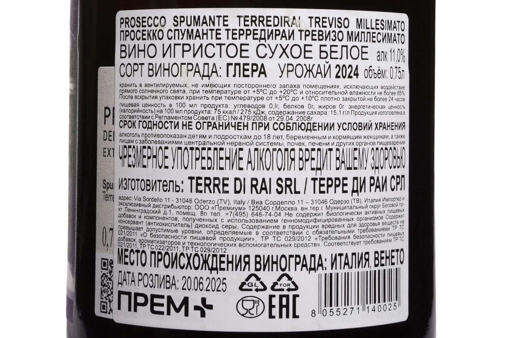 Игристое вино Terredirai Prosecco Treviso DOC Millesimato 2024 0,75 л изготовлено в итальянском регионе Венето. Урожай сорта Глера собирают исключительно вручную, выбирая только самые зрелые и здоровые ягоды. После бережного прессования начинается первичное брожение сусла, температура которого поддерживается строго от 16 до 18 °C. Вторичное брожение происходит в герметичных емкостях из стали по технологии Шарма в течение примерно двух месяцев. Именно такая технология обеспечивает напитку мелкие, стабильные пузырьки и сохраняет свежесть букета.