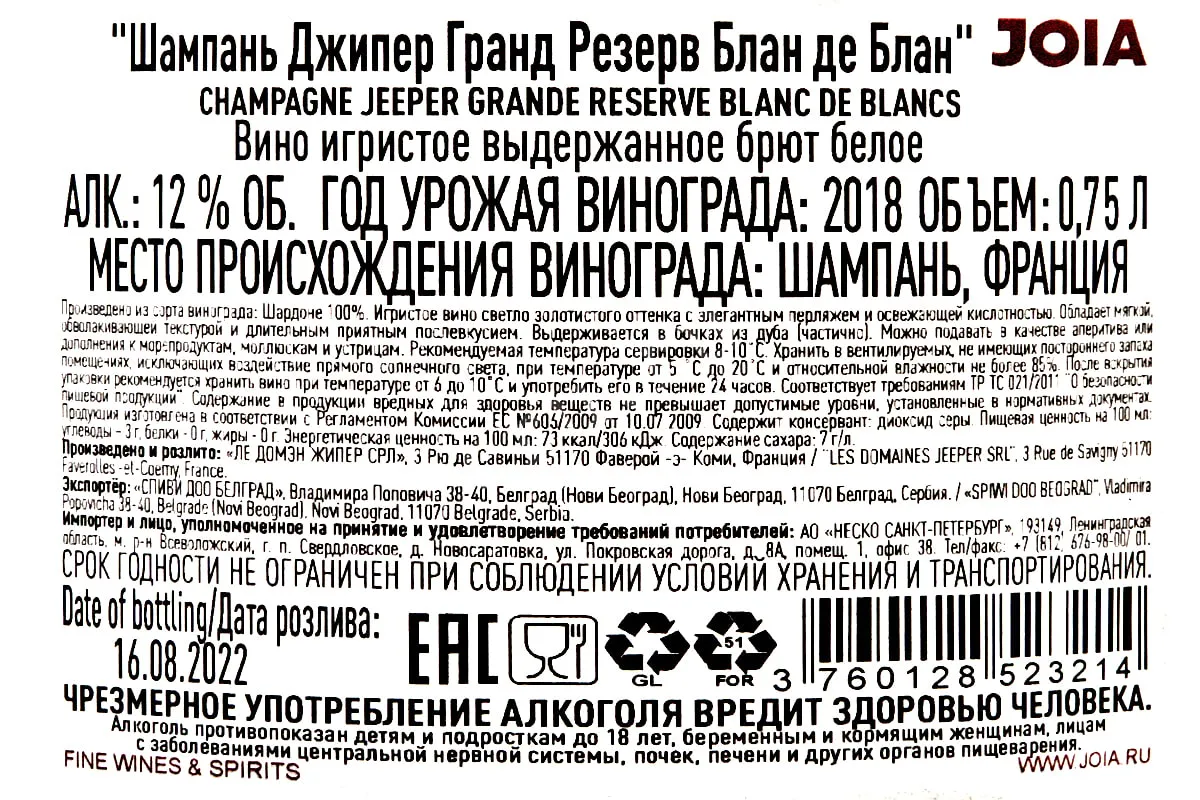 Jeeper Grand Reserve Blanc de Blancs 2018 0.75 л купить - шампанское Джипер Гранд Резерв Блан де Блан цена в магазине КРЮ ПРОФИ г. Москва, ул. Профсоюзная, д. 16/10 10:00-22:00 Ежедневно +7 (495) 920-20-02 info@cru.ru