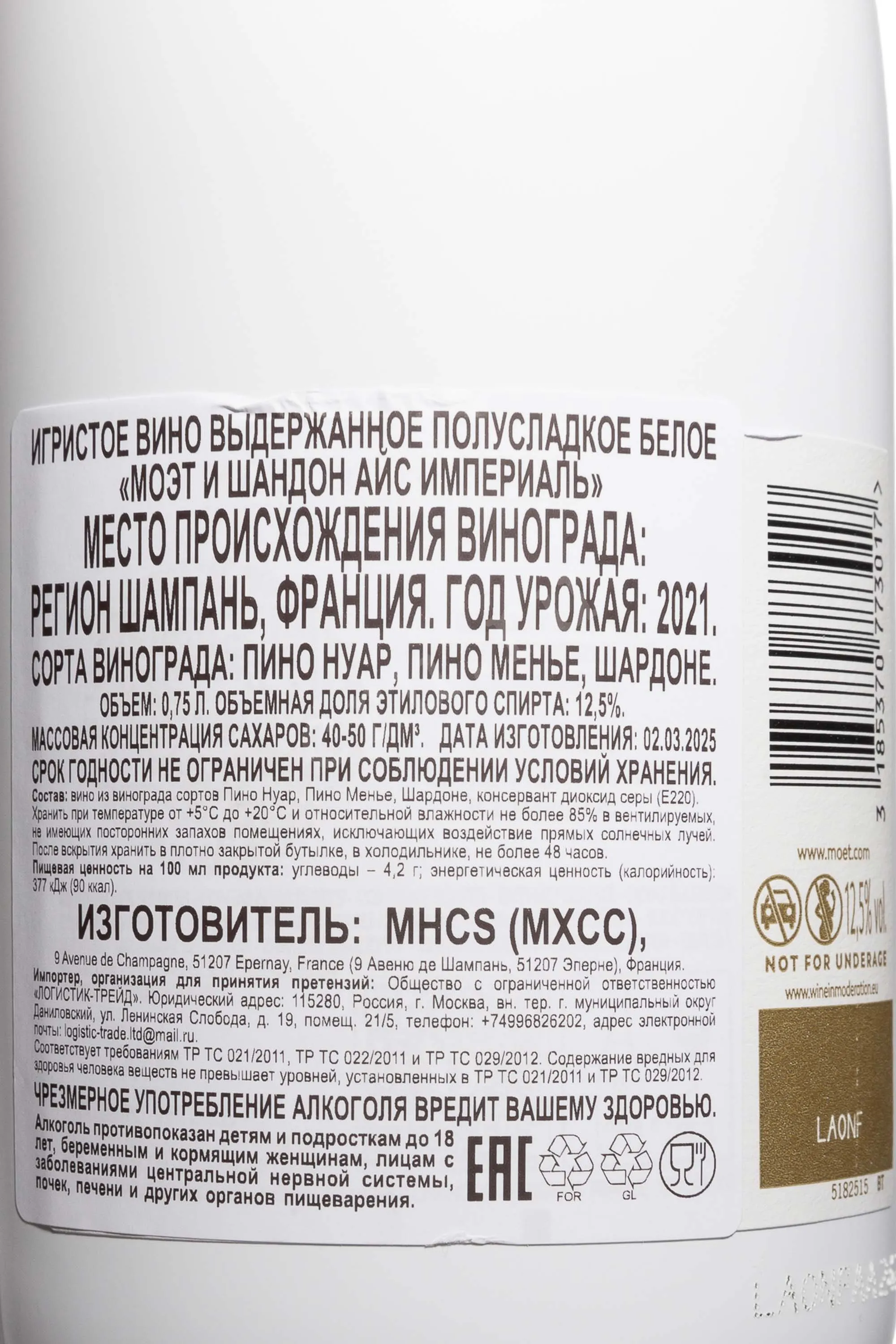 Шампанское белое полусухое Moet & Chandon Ice Imperial Demi-Sec 2021 г. 0,75 л происходит с меловых почв Шампани. Известняки и прохладный климат формируют яркую кислотность и тонкую фруктовость ягод. Рецепт купажа разработан специально для подачи со льдом, это выделяет его среди классических образцов. Урожай собрали с участков с разной экспозицией, чтобы получить устойчивую структуру и чистую ароматическую линию будущего напитка. Винификация проходила по традиционной технологии со вторичным брожением в бутылке. Дозировка выше, чем у брютов сохранила округлый характер и контраст между свежестью и мягкой сладостью.