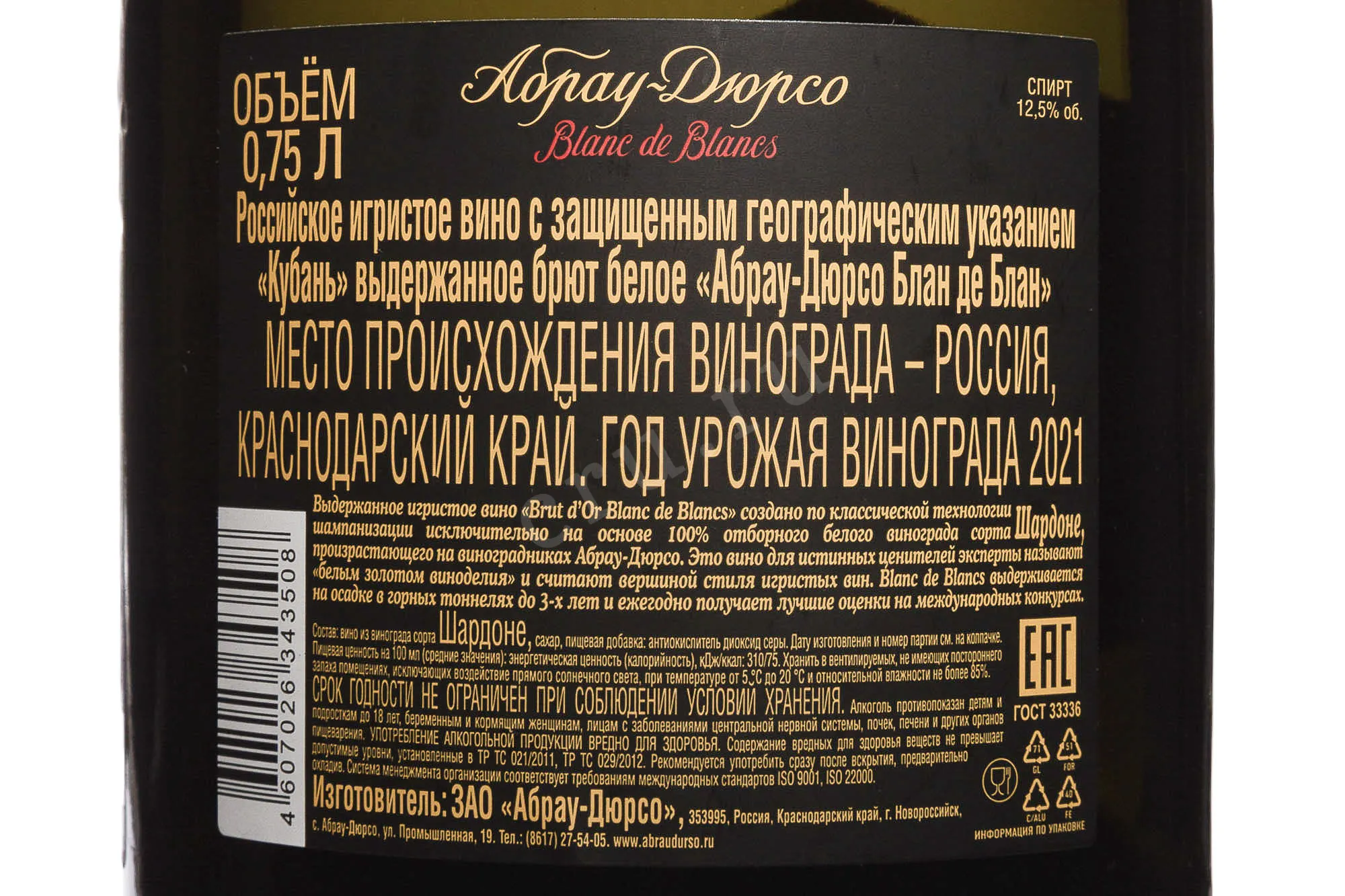 Игристое вино Абрау-Дюрсо Брют д'Ор Блан де Блан 2021 года 0,75 л — великолепное дополнение к праздничному ужину и роскошный подарок. Оно создано из сорта Шардоне, выращенного на склонах вокруг озера Абрау. Терруар здесь отличается мягким климатом, известняковыми и глинистыми почвами, что обеспечивает гармонию кислотности и минеральности. Урожай 2021 года оказался удачным: лето было теплым, без сильных перепадов температур, ягоды хорошо вызрели и сохранили свежесть. Производство проходило по классической технологии шампанизации с первичной ферментацией в стальных емкостях и вторичной в бутылке. Выдержка на тонком осадке длилась 3 года. Это игристое вино много раз становилось призером престижных конкурсов, каких как Mundus Vini, Decanter, IWC, Кубок СВВР.