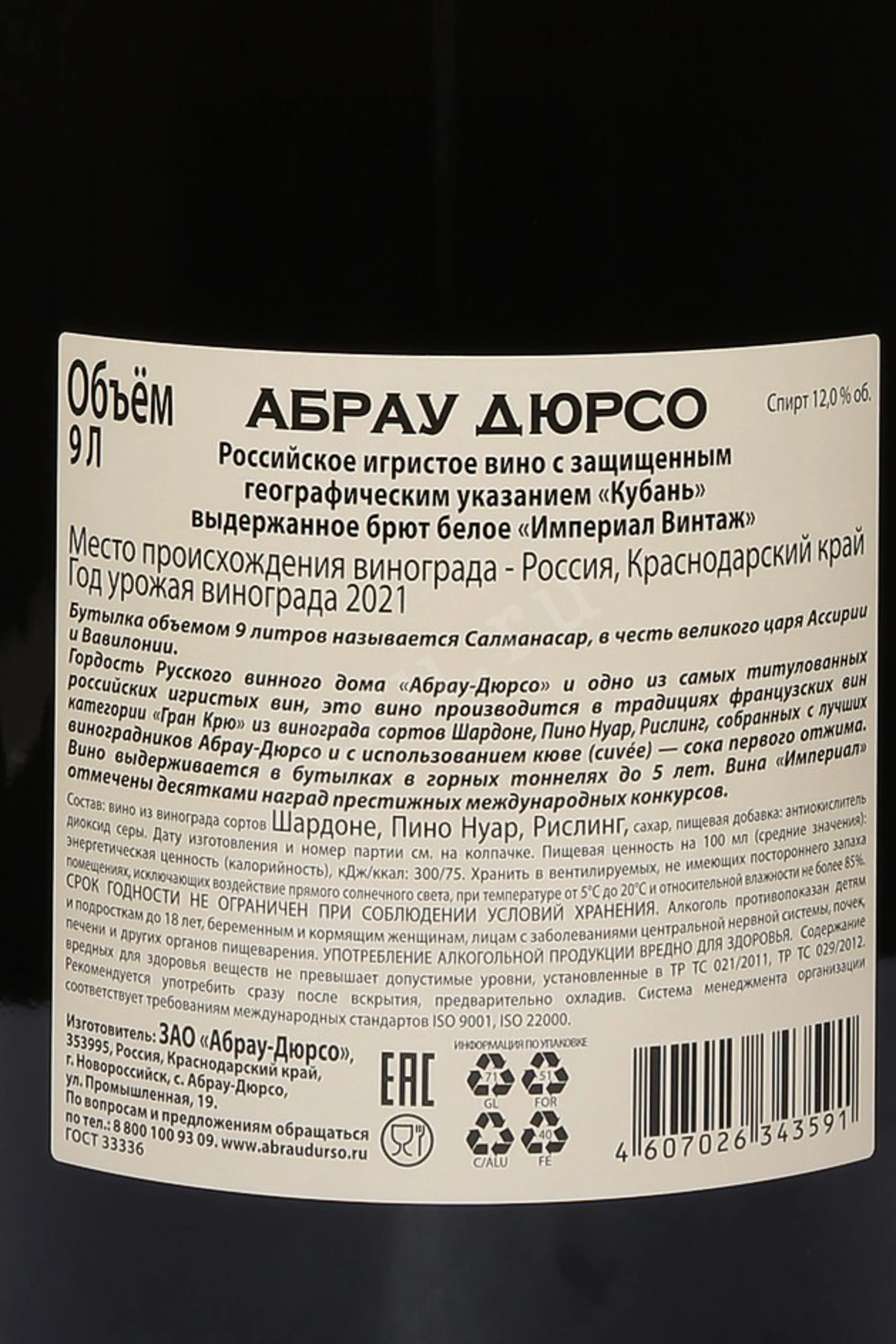 Игристое вино Абрау Дюрсо Империал Винтаж в деревянной коробке 2021 года 9 л — по-настоящему незабываемый, оригинальный и элитный подарок, который придаст значимость любому торжественному поводу. Подобный презент не останется незамеченным благодаря бутылке крупного формата, который имеет собственное название — Салманазар (Salmanazar). Премиальный белый брют поставляется в красивом деревянном ящичке, что гарантирует сохранность стеклянной тары. Это кюве создано в классическом стиле, который отражает лучшие традиции российского виноделия. Виноград был собран на склонах вокруг озера Абрау, где мягкий климат Черноморского побережья и известняковые почвы обеспечивают гармоничное созревание ягод. 2021 год отличался стабильной погодой без резких перепадов температур, что позволило получить сырье с хорошим балансом сахара и кислотности. Производство велось по традиционному методу шампанизации со вторичной ферментацией в бутылке и выдержкой на осадке в течение 5 лет, что придало игристому вину особую глубину и тонкость. Его не раз награждали медалями на престижных конкурсах. Оно уникально тем, что может храниться в стекле несколько десятилетий, а значит это хорошая инвестиция и вклад в будущее, ведь винтажные экземпляры всегда в цене.