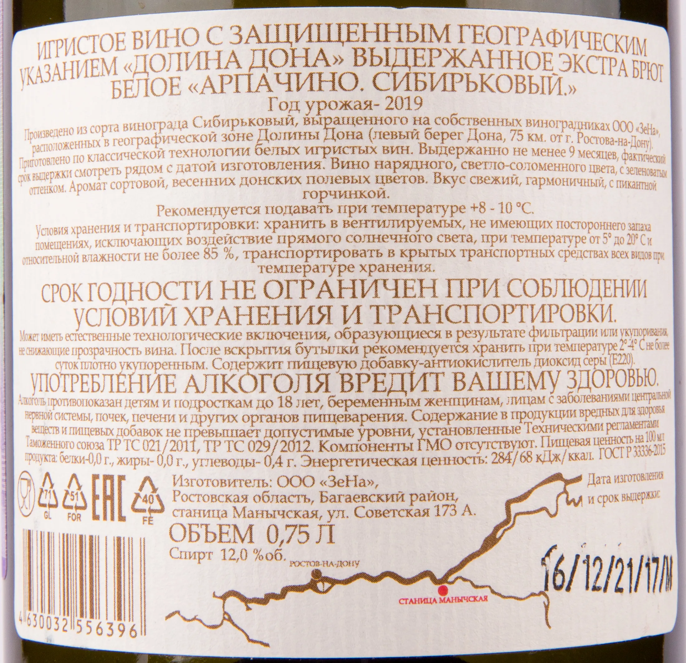 Игристое вино Арпачино Сибирьковый Экстра Брют 2019 0.75 л