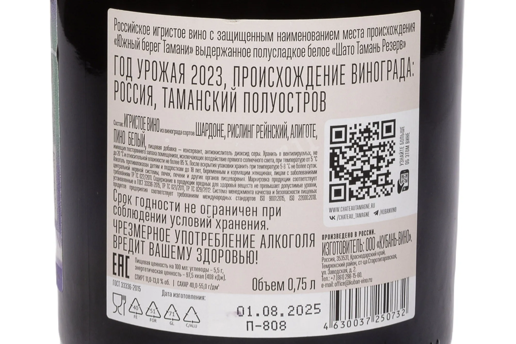 Игристое вино Шато Тамань Резерв Полусладкое 2023 года 0,75 л — это пример гармонии южного терруара и классического метода виноделия. Виноград выращивается на виноградниках агрофирмы «Южная» на Таманском полуострове, где мягкий морской климат и известково-глинистые почвы придают ягодам свежесть и минеральную тонкость. 2023 год отличался стабильной погодой, что позволило собрать ягоды оптимальной зрелости. Для производства используется виноград, прошедший строгий отбор. Сок получают методом самотека, без прессования, чтобы сохранить чистоту и нежность аромата. Вторичное брожение проходит в бутылке по традиционной технологии, после чего вино выдерживается не менее шести месяцев. Это придаёт напитку утонченную кремовую текстуру и устойчивое игристое кружево. Линейка «Резерв» неизменно получает высокие оценки российских дегустаторов за баланс сладости и кислотности, а также чистый сортовой профиль.