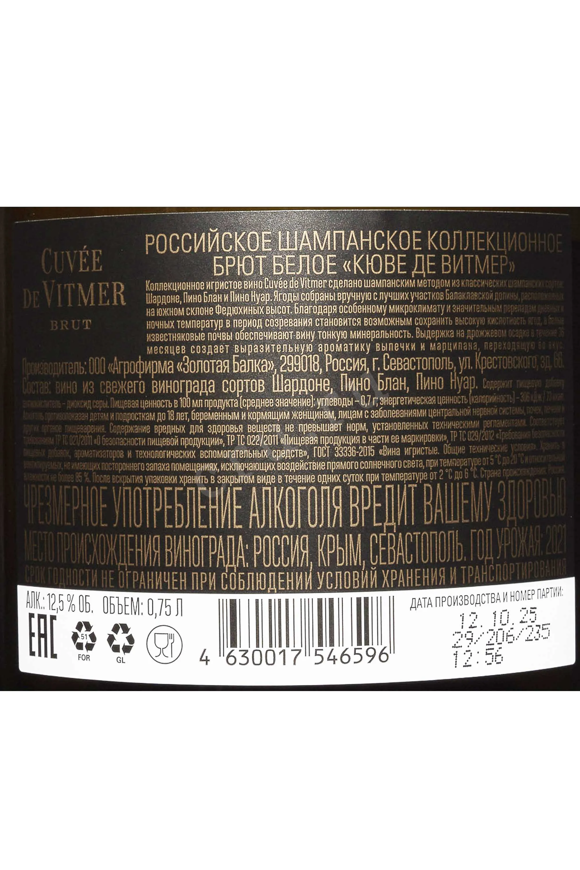 Игристое вино Балаклава Кюве де Витмер Брют 2021 года 0,75 л создано в традиционном французском стиле, но отмечено также крымским характером. Виноград был выращен на южных склонах Федюхиных высот, где известняковые почвы придают сырью минеральные тона, а перепады дневных и ночных температур помогают сохранить свежесть и кислотность. Урожай 2021 года оказался удачным: умеренно тёплое лето и сухая осень позволили ягодам равномерно созреть. Лозы возрастом около 30 лет дают виноград с концентрированным и сложным вкусом. Сбор урожая проводился вручную, ягоды сразу отправили на мягкое прессование. Первичная ферментация проходила в стальных резервуарах при 18 °C в течение 2 недель. Вторичное брожение проводилось по методу шампенуаз в бутылках. Выдержка на тонком дрожжевом осадке длилась 36 месяцев, формируя ароматы выпечки и миндаля. Линейка Cuvee de Vitmer посвящена Александру Витмеру — основателю крымского виноделия, чьё наследие вдохновило на создание этого благородного брютa.