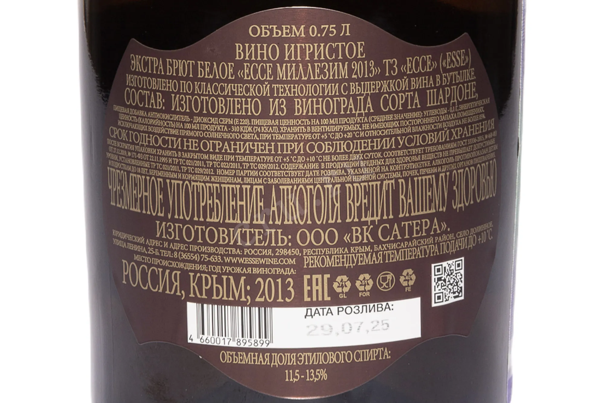 Игристое вино ЕССЕ Миллезим Брют Зеро Дозаж в подарочной упаковке 2013 года 0,75 л создано в Крыму из винограда сорта Шардоне, выращенного в прибрежных терруарах с мягким климатом и известняковыми почвами. 2013 год отличился умеренным летом и долгим теплым осенним периодом, что обеспечило ягодам идеальный баланс кислотности и сахара. Вино произведено методом классической шампанизации с выдержкой на осадке в течение 10 лет, что обеспечило сложную структуру и редкую глубину вкуса. Стиль — экстра-сухой, без добавления дозажного ликера, что подчеркивает чистоту сортовых оттенков и натуральность вина. Оно считается одним из самых выразительных отечественных образцов категории брют зеро, отмечено высокими оценками сомелье и ценителей за мастерство исполнения и неповторимую элегантность.
