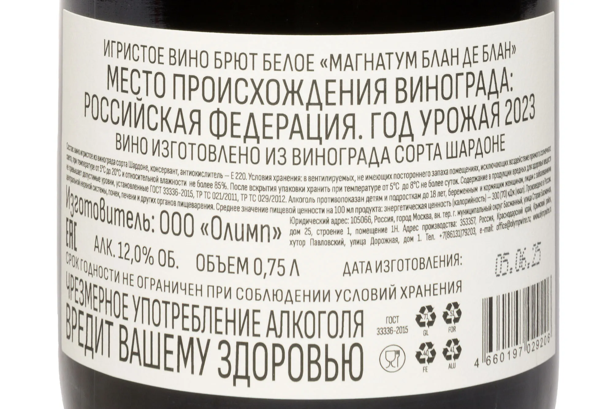 Игристое белое вино брют Magnatum Methode Champenoise Brut Blanc De Blancs 2023 г. 0,75 л создано по классической технологии вторичного брожения в бутылке, что обеспечило напитку глубину и устойчивую пену. Образец сделали из ягод белого сорта, собранных на прохладных участках, где умеренный климат способствовал медленному созреванию и сохранению высокой кислотности. Винификация была проведена при низких температурах, после чего сброженное дважды сусло выдержали на дрожжевом осадке несколько месяцев. Эта практика завершила формирование структуры, придала объём и привнесла сложный набор тонких нюансов в букет.