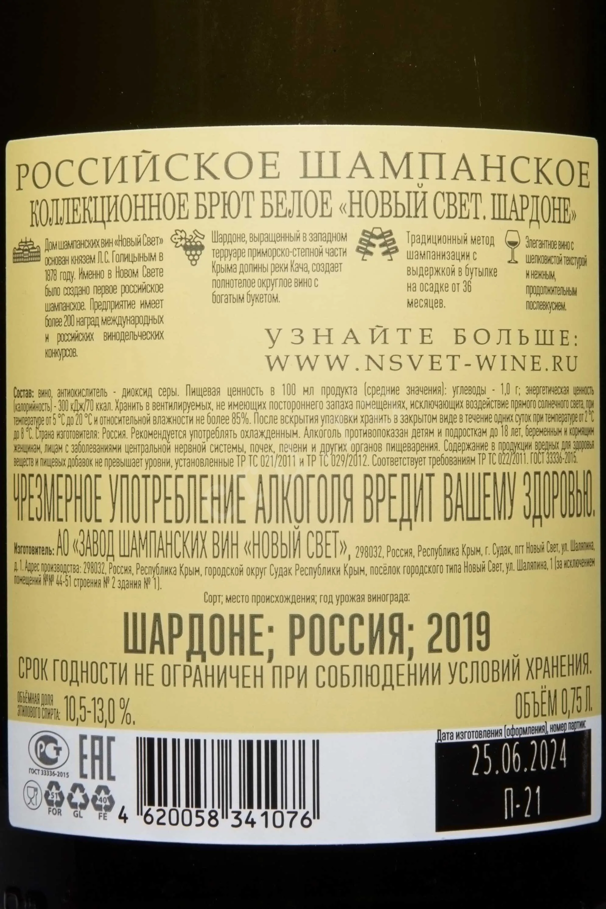 Новый Свет Шардоне Коллекционное Брют 2019 0.75 л купить - Российское игристое вино Novy Svet Chardonnay Brut цена игристого вина в магазине КРЮ ПРОФИ г. Москва, ул. Профсоюзная, д. 16/10 10:00-22:00 Ежедневно +7 (495) 920-20-02 info@cru.ru