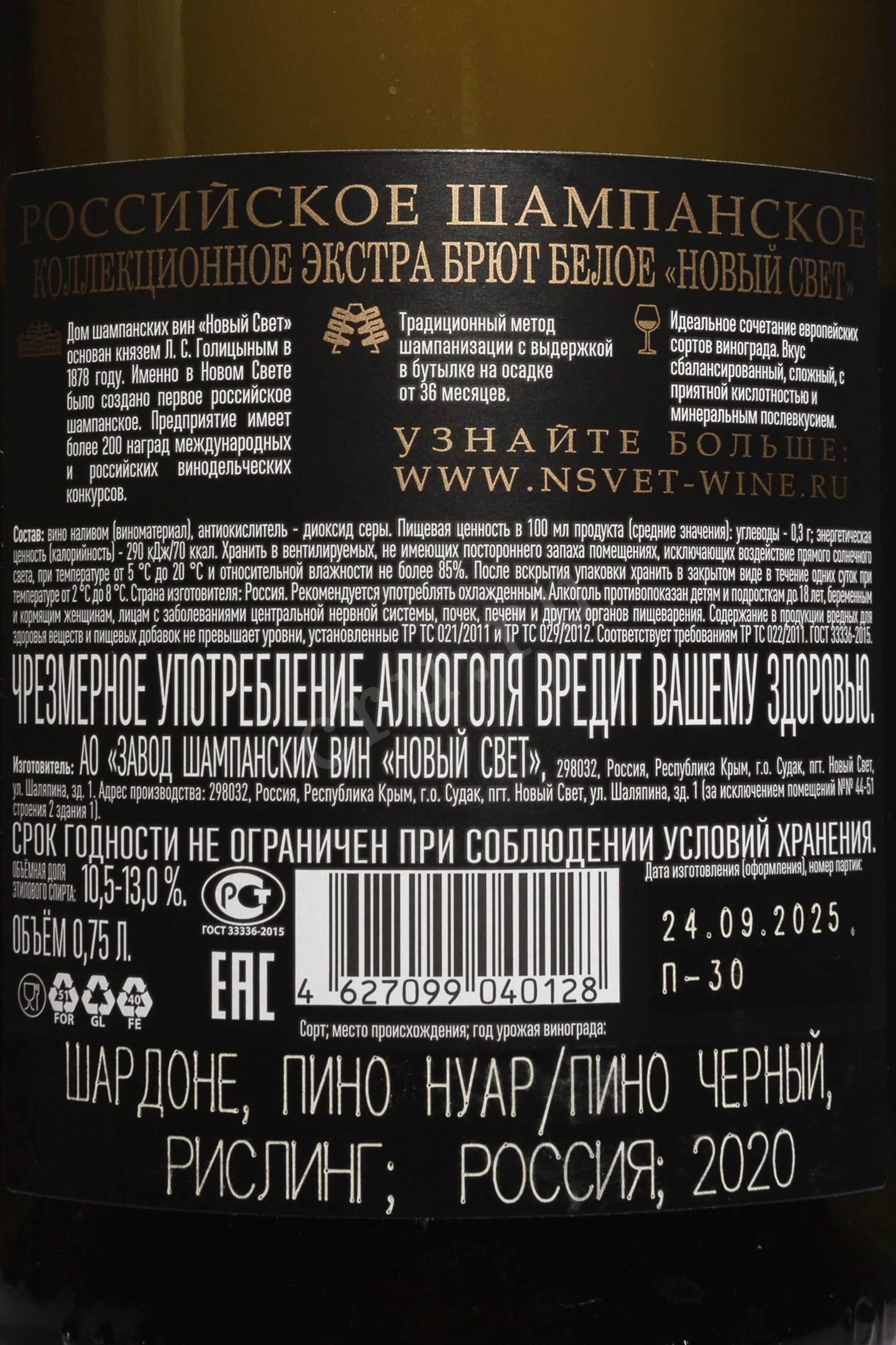 Игристое белое вино Новый Свет Коллекционное Экстра Брют 2020 г. 0,75 л создано в районе, где морские ветры и известняковые почвы формируют строгий стиль базового вина. Ягоды для винификации собирали вручную на отдельных участках с пониженной урожайностью. Переработка шла по принципу бережного прессования, чтобы получить чистый сок первой фракции. Вторичное брожение проходит в бутылке, как в классическом шампанском методе. В завершение последовала выдержка на осадке не менее 36 месяцев.