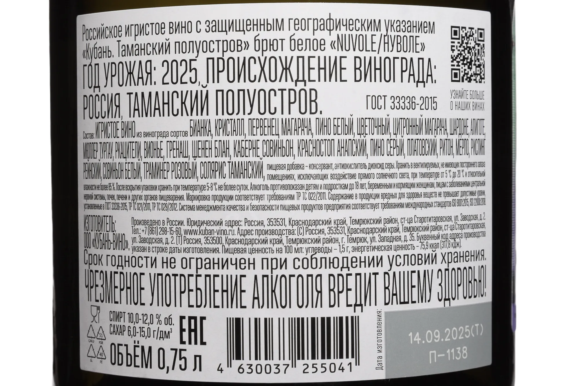 Игристое вино Нуволе Брют 2025 года 0.75 л создано в современном стиле, с акцентом на чистоту вкуса и тонкую свежесть. Виноград выращен на Таманском полуострове, где тёплый климат, близость моря и известковые почвы формируют яркий характер ягод. Урожай 2025 года созревал в условиях стабильного лета и сухой осени, что обеспечило хорошее качество сырья. Ягоды собирали вручную при достижении оптимальной спелости. Первичная ферментация проходила при контролируемой температуре в стальных резервуарах. Вторичная ферментация проводилась методом Шарма в акратофорах, что позволило сохранить свежесть и лёгкие фруктовые оттенки. Вино относится к линейке Нуволе, разработанной компанией Шато Тамань совместно с Simple, и отражает стиль региона. Линейка новая, но проект уже получил положительные отзывы как перспективное направление в российском виноделии.