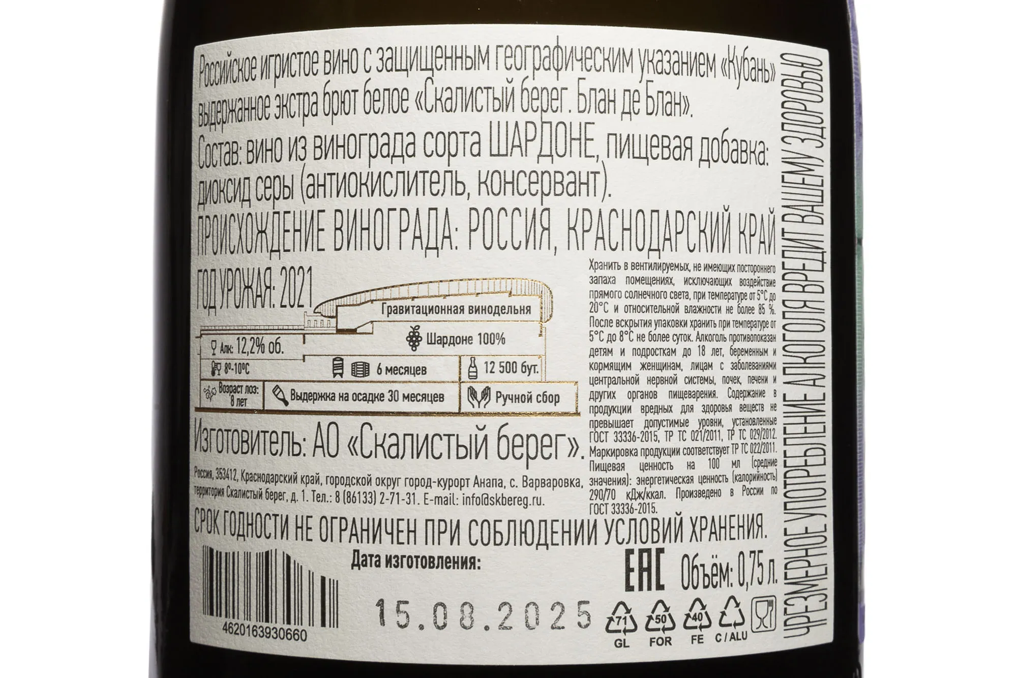 Игристое белое вино экстра-брют Скалистый берег Блан де Блан 2021 г. 0,75 л создано в прибрежной зоне с прохладным климатом, где мягкие ветра и известняковые почвы формируют строгий, чистый стиль напитка. Напиток сделали методом классической вторичной ферментации в бутылке, что обеспечило стойкий перляж и точную структуру. Урожай для винификации собрали вручную, чтобы сохранить целостность ягод и добиться высокого качества. Сброженный дважды сок оставили созревать на дрожжевом осадке, благодаря чему в миллезиме появился объем и легкая минеральная линия.