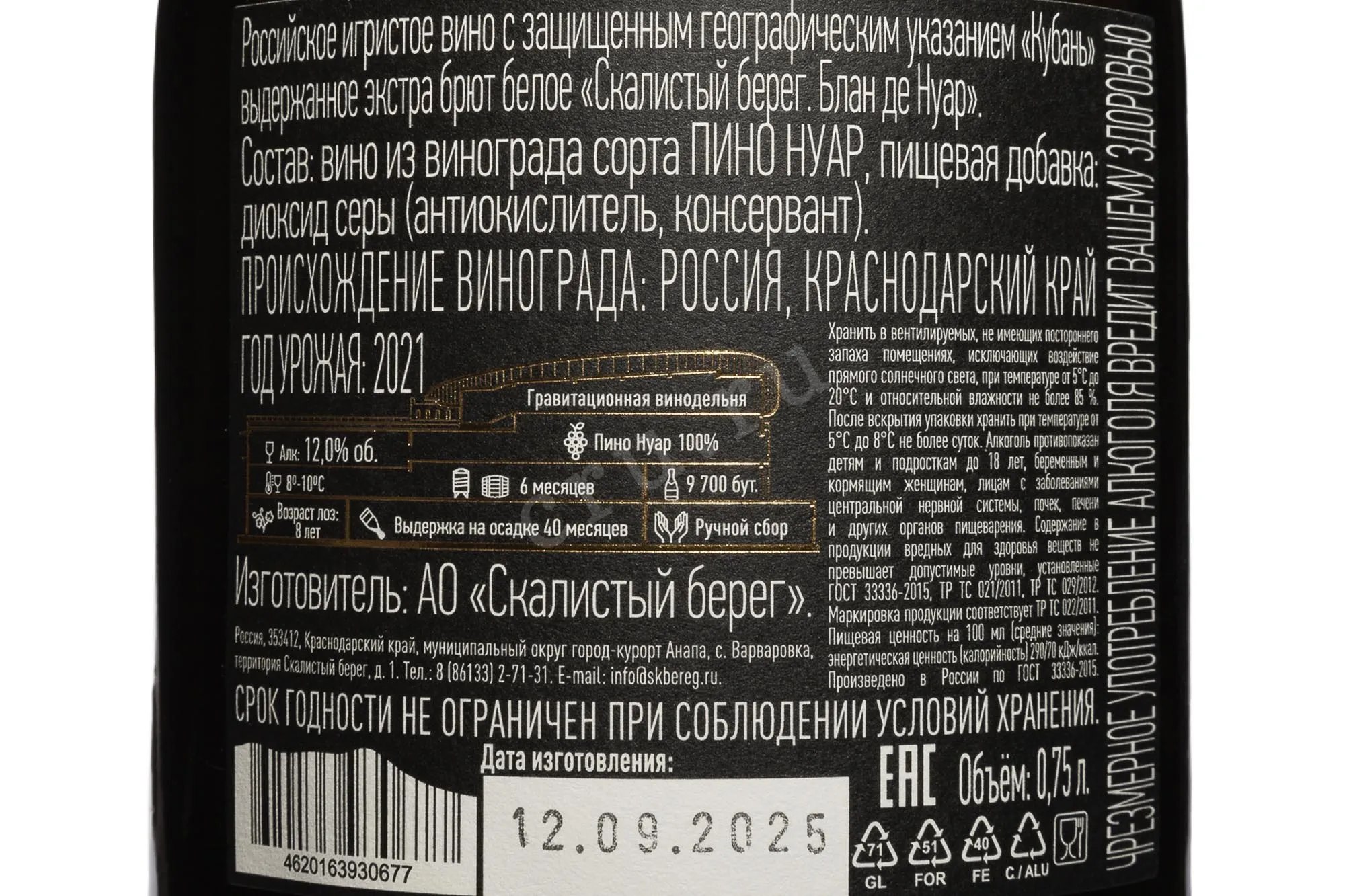 Игристое белое вино экстра-брют Скалистый берег Блан де Нуар 2021 г. 0,75 л происходит из кубанского терруара. Урожай собрали вручную в один сезон в Анапе, где морское влияние, солнечные склоны и каменистые почвы формируют характерный стиль напитков. В качестве сырья использовали ягоды красного сорта, которые мягко прессовали, а сок сразу отделили от мезги, чтобы он не окрасился. Первичное брожение провели в стальных резервуарах при контролируемой температуре, вторичное — в бутылках по традиционной технологии, с длительной выдержкой на осадке, которая придаёт напитку сложность и устойчивый перляж. Стиль экстра-брют подчёркивает природную точность сорта без вмешательства дозажа.
