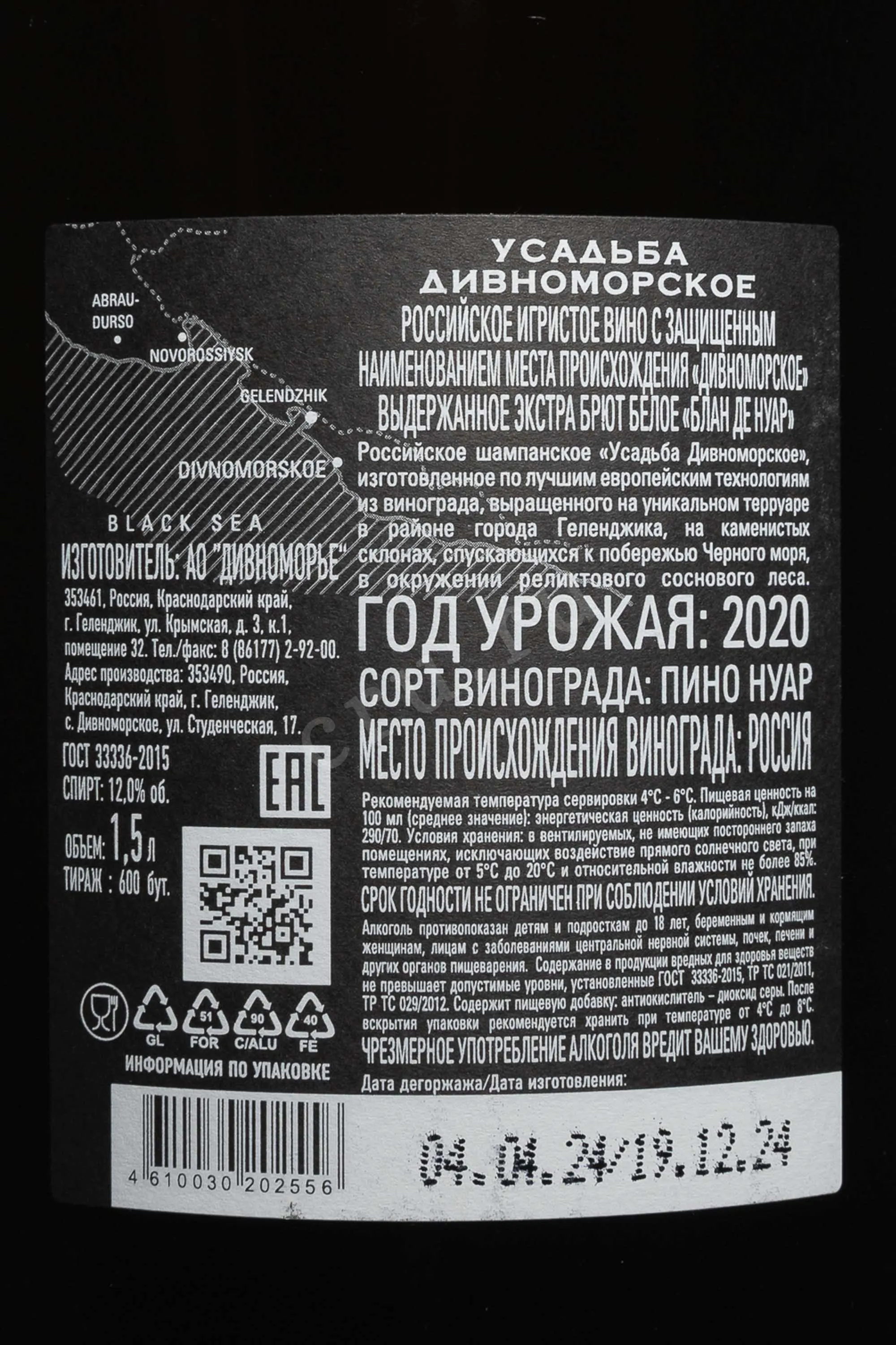 Белое сухое вино Усадьба Дивноморское Блан де Нуар Брют 2020 г. 1,5 л создано из красных ягод распространённого бургундского и мирового сорта винограда. Плоды созрели в зоне с выраженным морским влиянием, продолжительным солнечным периодом и умеренными перепадами температур, в окружении реликтовых хвойных лесов. Сырьё собрали вручную и переработали по классической схеме шампенуаз. Перед первичной ферментацией провели краткую криомацерацию, чтобы извлечь ароматические компоненты без окрашивания сусла. Далее сок сбродили в стальных резервуарах и французских барриках, подвергли полному яблочно-молочному брожению и разлили по бутылкам для насыщения углекислотой. Выдержка на осадке составила не менее 24 месяцев. Формат магнум способствует более медленному развитию и продлевает срок хранения в нераспечатанной ёмкости.