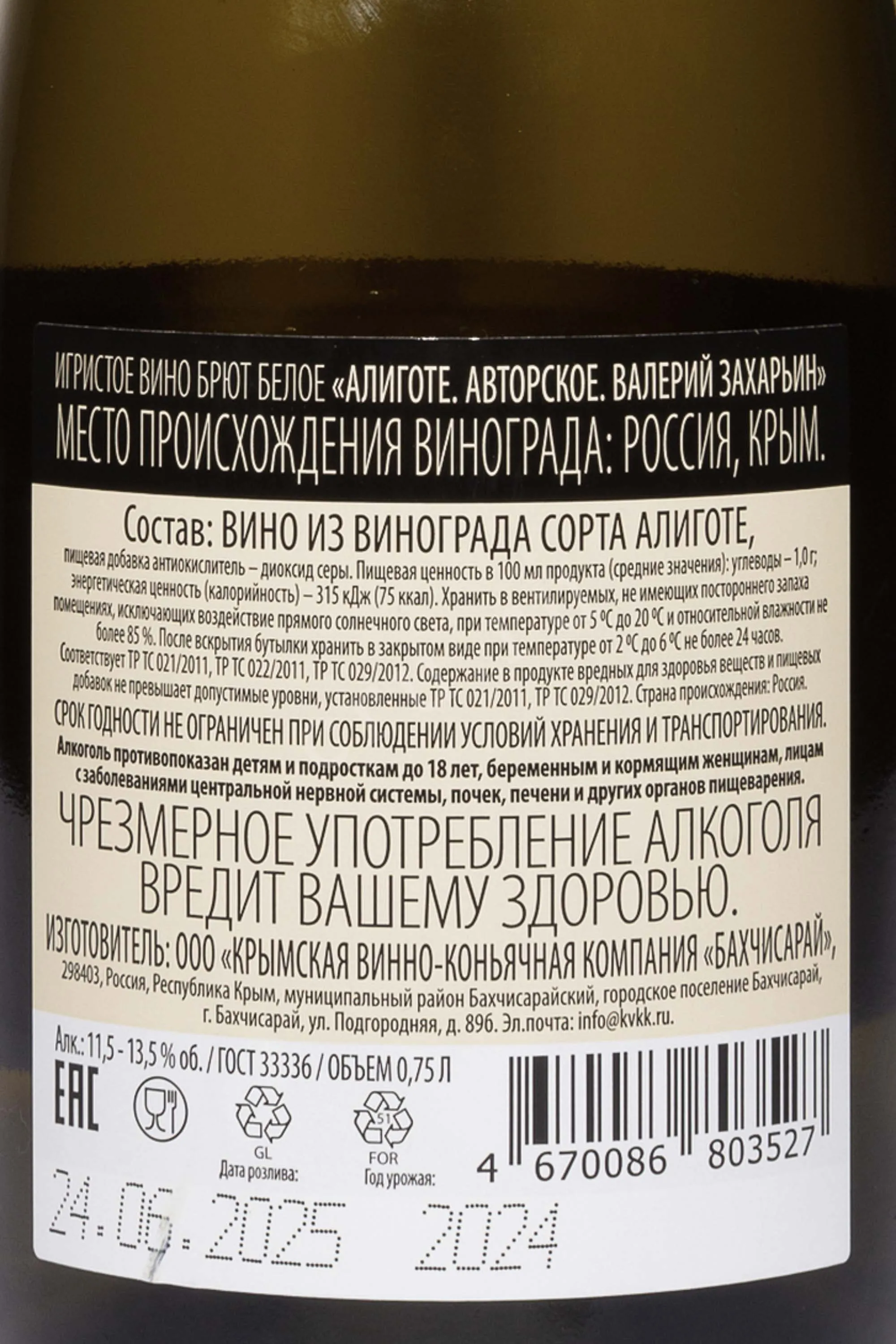 Игристое вино Валерий Захарьин Алиготе 2024 года 0,75 л — это изящный белый брют с яркой свежестью и тонкой игрой пузырьков. Виноград сорта Алиготе выращен на солнечных склонах Бахчисарайского района Крыма, где известняковые почвы и мягкий морской климат придают ягодам особую минеральность и утонченность. 2024 год отличился стабильной погодой без экстремальной жары и проливных дождей, что позволило собрать виноград оптимальной зрелости. Сбор урожая проводили вручную, чтобы сохранить целостность ягод и исключить недозрелые плоды. Первичная ферментация проходила в стальных емкостях при контролируемой температуре. Затем по методу Шарма осуществлялось вторичное брожение, формирующее естественную игристую структуру. Это авторской вино с четким, свежим и гармоничным характером отражает современный стиль крымского виноделия.