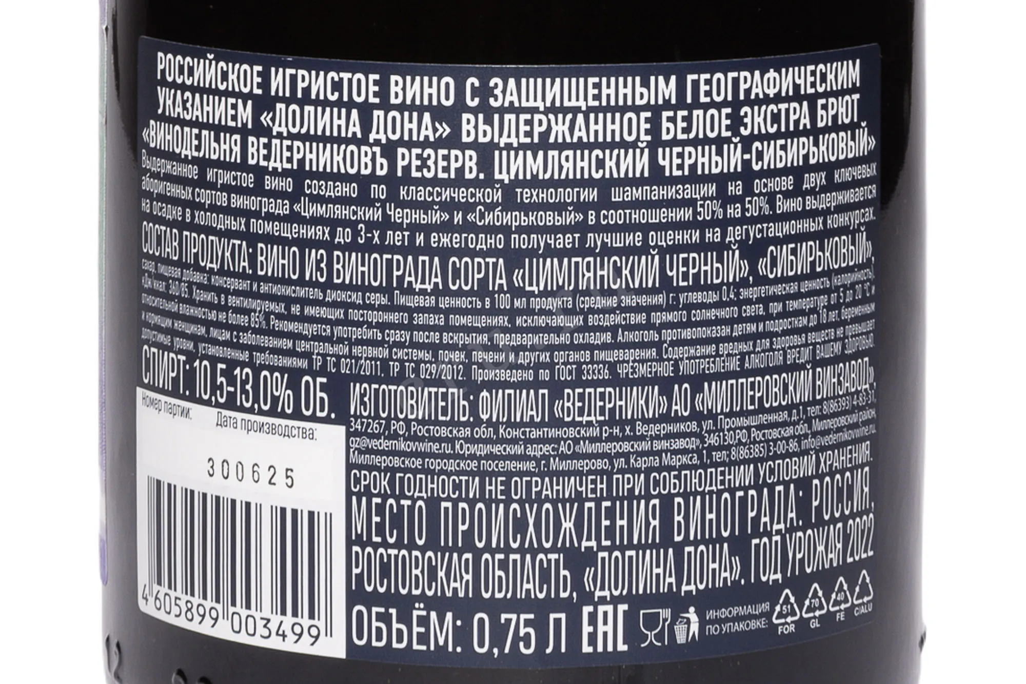 Игристое белое вино Винодельня Ведерниковъ Резерв Цимлянский Чёрный Сибирьковский Экстра брют 2022 года 0,75 л — редкий пример российского игристого, созданного по классической технологии из автохтонных сортов Дона. Виноград выращивается в Цимлянском районе, где песчаные почвы и континентальный климат формируют яркий характер и свежую кислотность ягод. 2022 год отличался стабильной погодой без резких перепадов температуры, что позволило получить сбалансированные и ароматные ягоды. Вино произведено методом вторичного брожения в бутылке с длительной выдержкой на осадке (2,5 года), что придало обеспечило ему кремовую текстуру и сложный букет. Особенность этого экстра брюта — сочетание двух редких, исконно донских сортов, Цимлянского Чёрного и Сибирьковского.