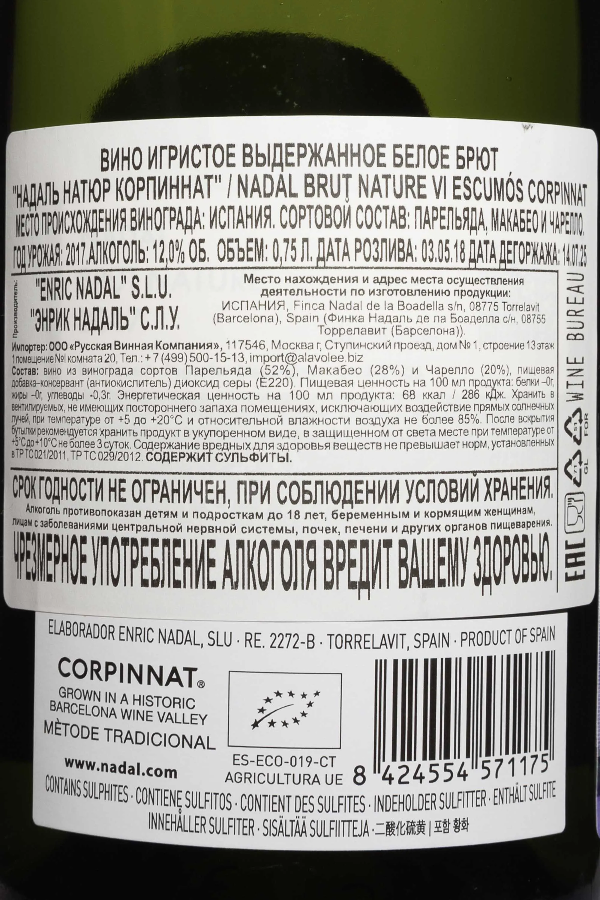 Игристое белое вино Nadal Brut Nature Corpinnat 2017 г. 0,75 л – миллезимный образец от кмпании, которая относится к числу исторических виноделен региона и входит в ассоциацию Корпиннат. Напиток создан в категории брют-натюр без добавления дозажного ликёра, благодаря чему проявляет выразительный природный характер. Для винификации использовали ягоды, собранные вручную исключительно с собственных участков производителя. Известняковые и глинистые склоны с хорошей инсоляцией и естественной вентиляцией и средиземноморский климат с выраженным влиянием моря и прохладными ночами способствовал развитию плодов с богатой органолептикой и достаточной кислотностью. Сусло дважды сбраживалось согласно классическому методу. Второе брожение проходило на мезге, после чего кюве несколько лет созревало на осадке.