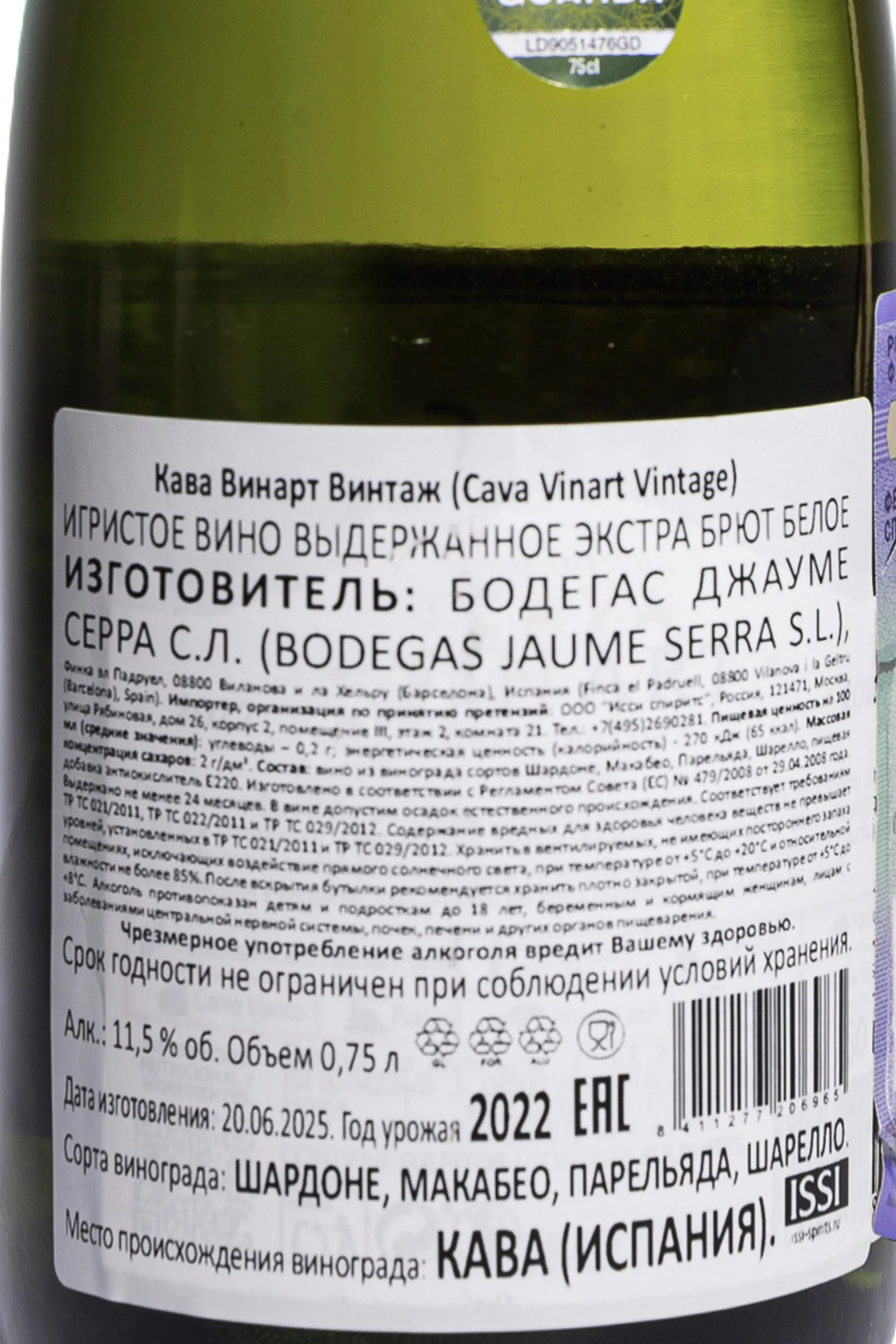 Игристое белое вино брют-натюр Cava Vinart Vintage 2022 г. 0,75 л создано в классическом стиле кавы, в котором важна точность работы с базовым виноматериалом и медленное созревание на осадке. Виноград выращен на холмах Каталонии. Почвы здесь известковые и бедные, что даёт ягодам хорошую кислотность и чистый характер. Урожай собрали вручную. Брожение проходило при низкой температуре, а вторичная ферментация протекала в бутылке. Дальнейшая выдержка на осадке сформировала стройную структуру и элегантный вкус.