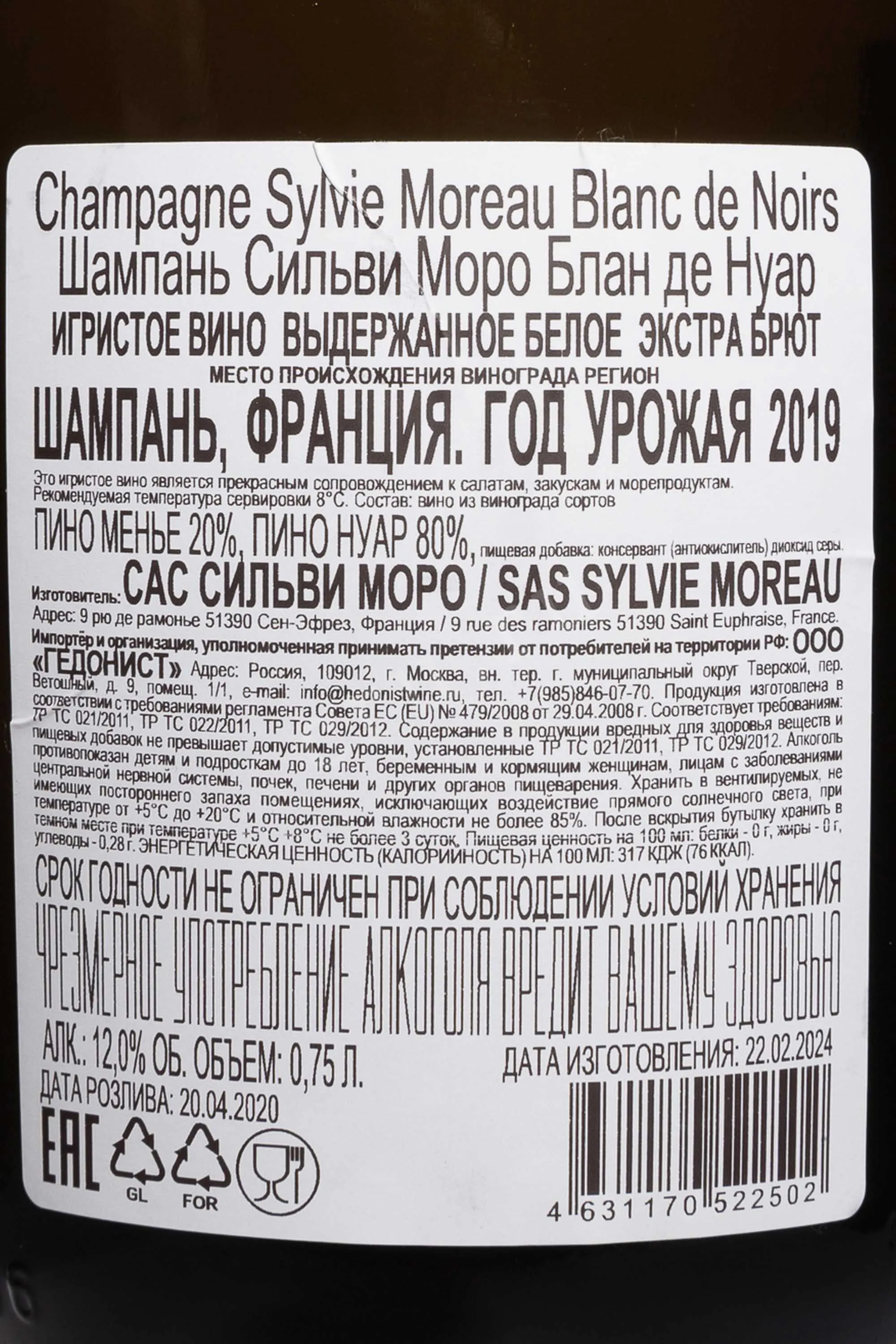 Шампанское белое экстра-брют Sylvie Moreau Blanc De Noirs 2019 г. 0,75 л создано из урожая классических северных склонов Монтань де Реймс, где Пино Нуар достигает особой зрелости благодаря известняковым почвам и прохладному климату. Терруар дает ягоде плотность и выразительный минеральный рисунок. Производитель придерживается традиционного подхода: мягкое прессование, ферментация в нейтральных емкостях и длительное созревание на осадке. Этот выпуск отличается плотным стилем Blanc de Noirs с акцентом на структуру и энергичную кислотность. Шампанское выпускается с минимальным дозажем в категории Extra-Brut, что подчеркивает чистоту сорта. Год 2019 дал концентрированное сырье с хорошим балансом сахара и кислот. Длительная выдержка в бутылке формирует сложность и устойчивый профиль. Вино демонстрирует стиль небольших авторских хозяйств, ориентированных на точное отражение характера виноградника.