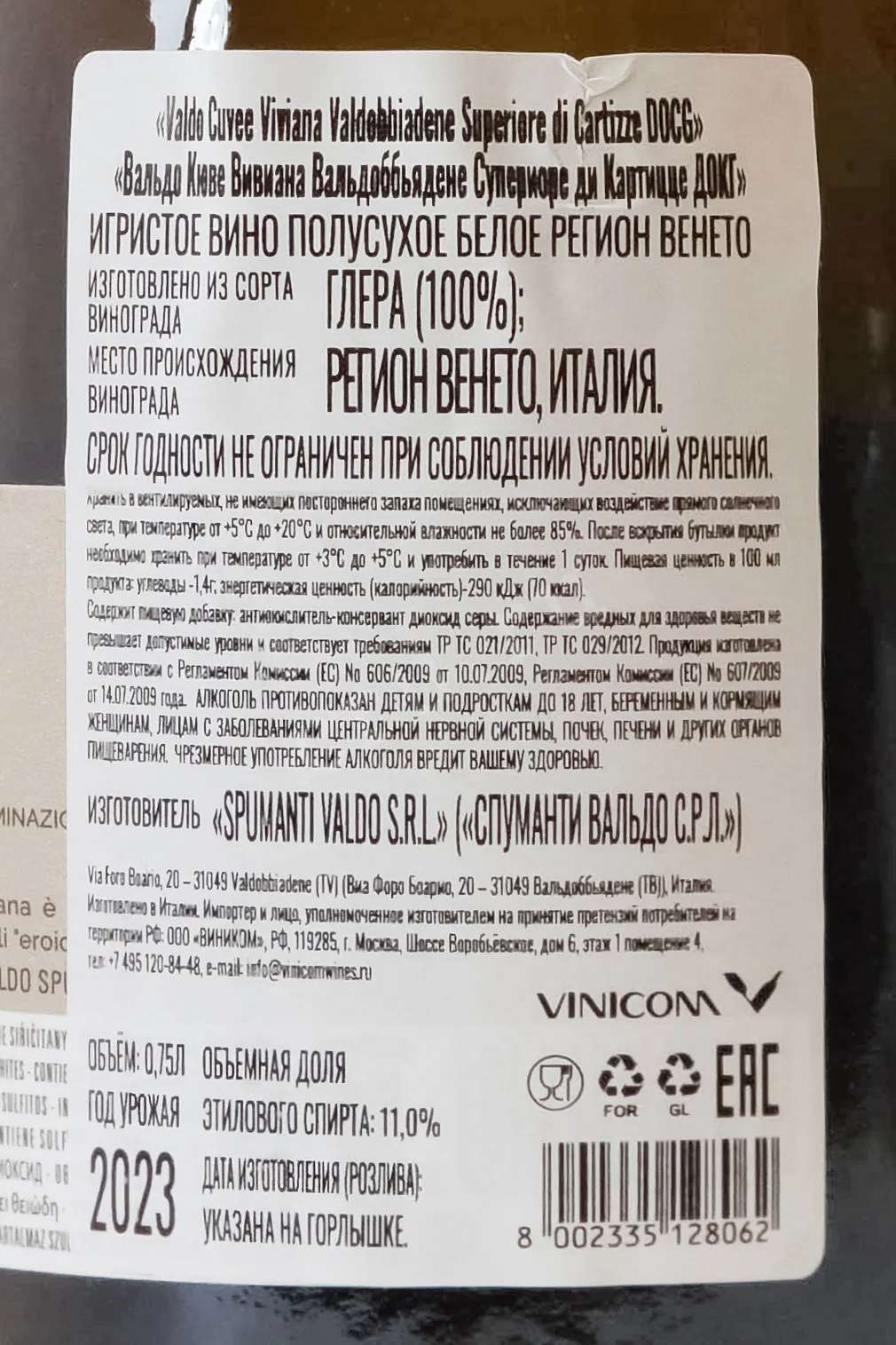 Игристое вино Valdo Cuvee Viviana Valdobbiadene Superiore di Cartizze 2022 года 0,75 л — элегантное просекко высшей категории из зоны Картицце в регионе Вальдоббьядене на севере Италии. Виноград был выращен на крутых холмах на высоте около 350-400 метров, на известняково-глинистых почвах. Они хорошо удерживают влагу и способствуют медленному созреванию ягод. В 2022 году тёплая и стабильная погода позволила собрать здоровый и ароматный виноград. После мягкого прессования применялась короткая криомацерация для извлечения ароматических веществ. Первичная ферментация проходила при контролируемой температуре с использованием селекционных дрожжей. Вторичное брожение выполнялось по методу Мартинотти-Шарма в герметичных автоклавах при 16–18 °C. Затем вино выдерживалось на осадке около четырёх месяцев, что добавило глубину и мягкую текстуру. Кюве посвящено Вивиане Бернарди, супруге основателя хозяйства Вальдо. Оно получало медали престижных конкурсов International Wine & Spirit Competition, Wine Hunter и Vinitaly.