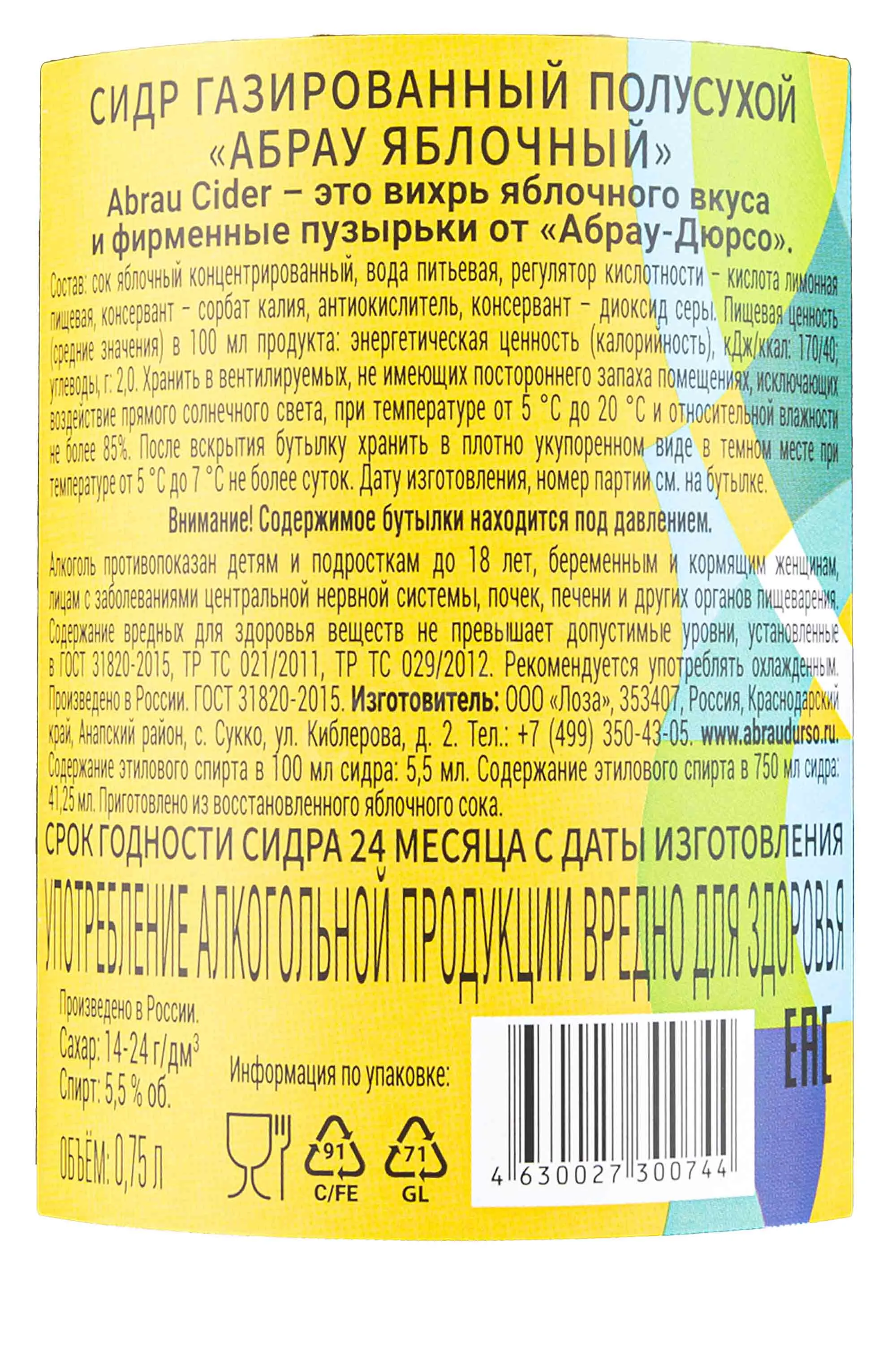 Abrau Apple Semidry 0.75 л купить - Сидр Абрау Яблочный полусухой цена в магазине