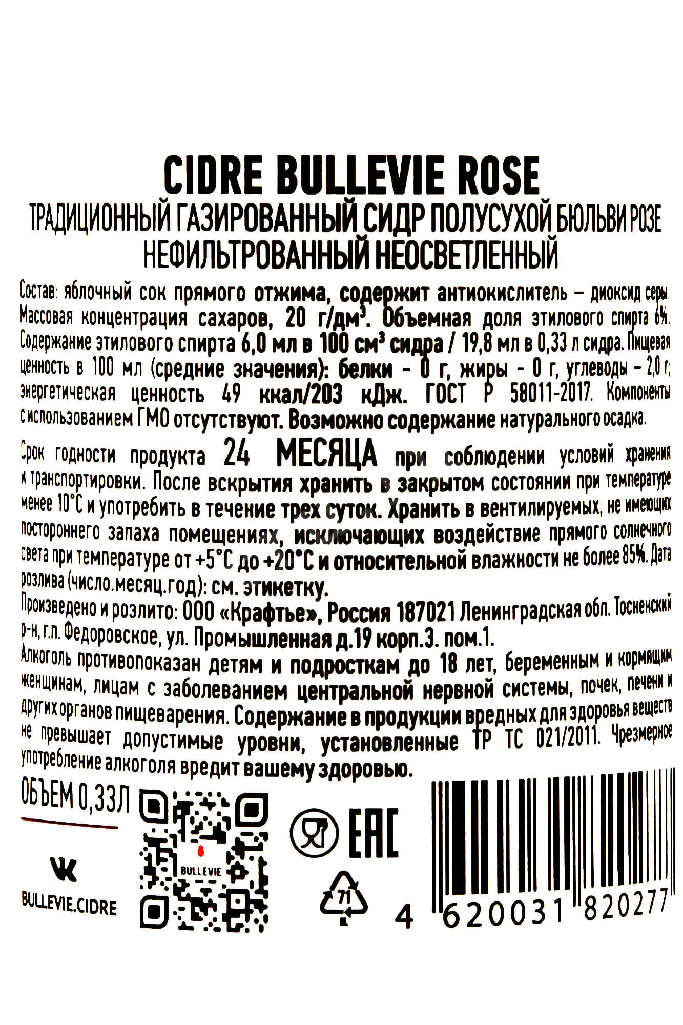 Сидр Bullevie Rose 0,33 л производится из яблочного сока, полученного методом прямого отжима. Яблоки прессуют сразу после сбора, чтобы сохранить природный аромат, а отжатое сусло сбраживают. Напиток не проходит фильтрацию и осветление, поэтому сохраняет живой вкус, а красивый цвет ему придает сусло из фруктов с окрашенной мякотью. Образец изготавливается небольшими партиями. Низкая крепость и компактный формат позволяют наслаждаться им без ощущения тяжести. Это удобный вариант для вечеринки, посиделок, пикника, путешествия.