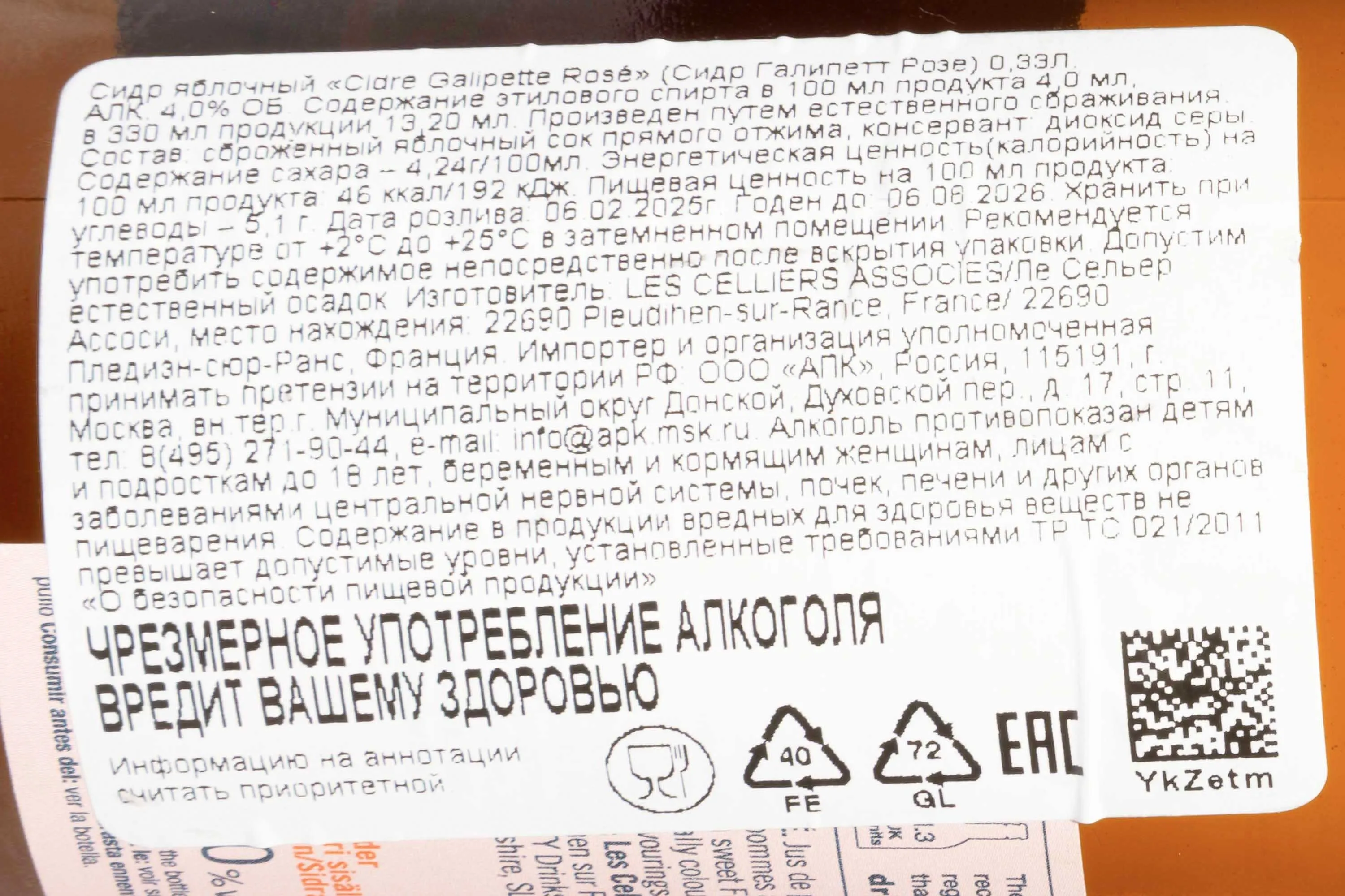 Сидр Galipette Rose 0.33 л отличился свежестью и элегантностью. Он был создан по традиционной французской технологии из тщательно отобранных яблок. При его производстве использовался метод натурального брожения без добавления концентратов, сахара или газов, что придавало напитку подлинную аутентичность. Ферментация проходила в контролируемых условиях, благодаря чему сохранялись тонкие фруктовые оттенки и естественная игристость. Каждый этап выдержки обеспечивал гармонию вкуса и аромата, а лёгкая розовая окраска появлялась за счёт особых сортов яблок с красноватой кожурой, использованных в купаже. Напиток передает атмосферу сидровых хозяйств Нормандии, где ценятся чистота вкуса и уважение к традициям.