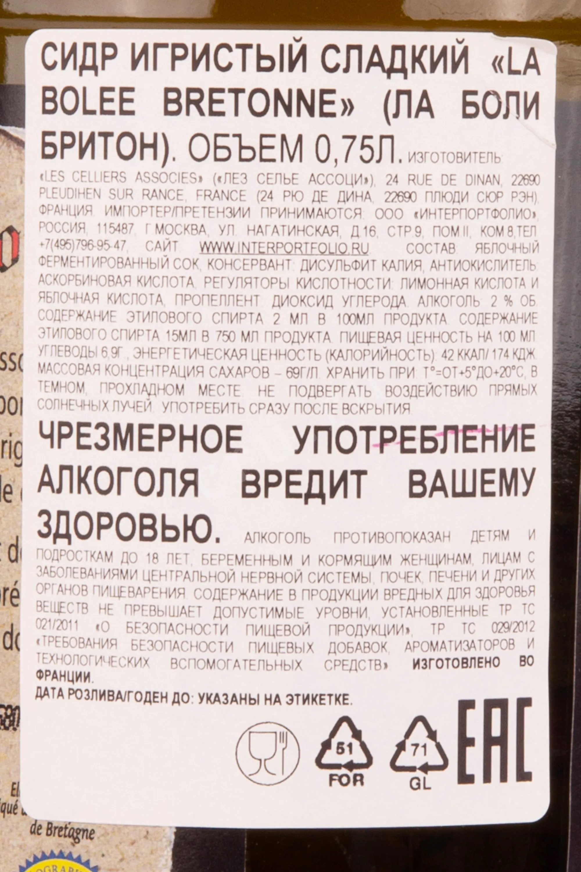 Сидр La Bolee Bretonne Cidre Doux 0,75 л — традиционный бретонский сладкий напиток из фруктового сырья. Он сделан на северо-западе Франции, в историческом регионе Бретань. В качестве основы для производства служит сок, полученный путём прессования специально отобранных сидровых яблок. Производитель указывает на использование классического метода естественной ферментации, при котором брожение останавливается до полного сбраживания сахаров. Благодаря этому сохраняется мягкая сладость и умеренная крепость. Образец — газированный, с природной свежестью и выраженной фруктовой направленностью.