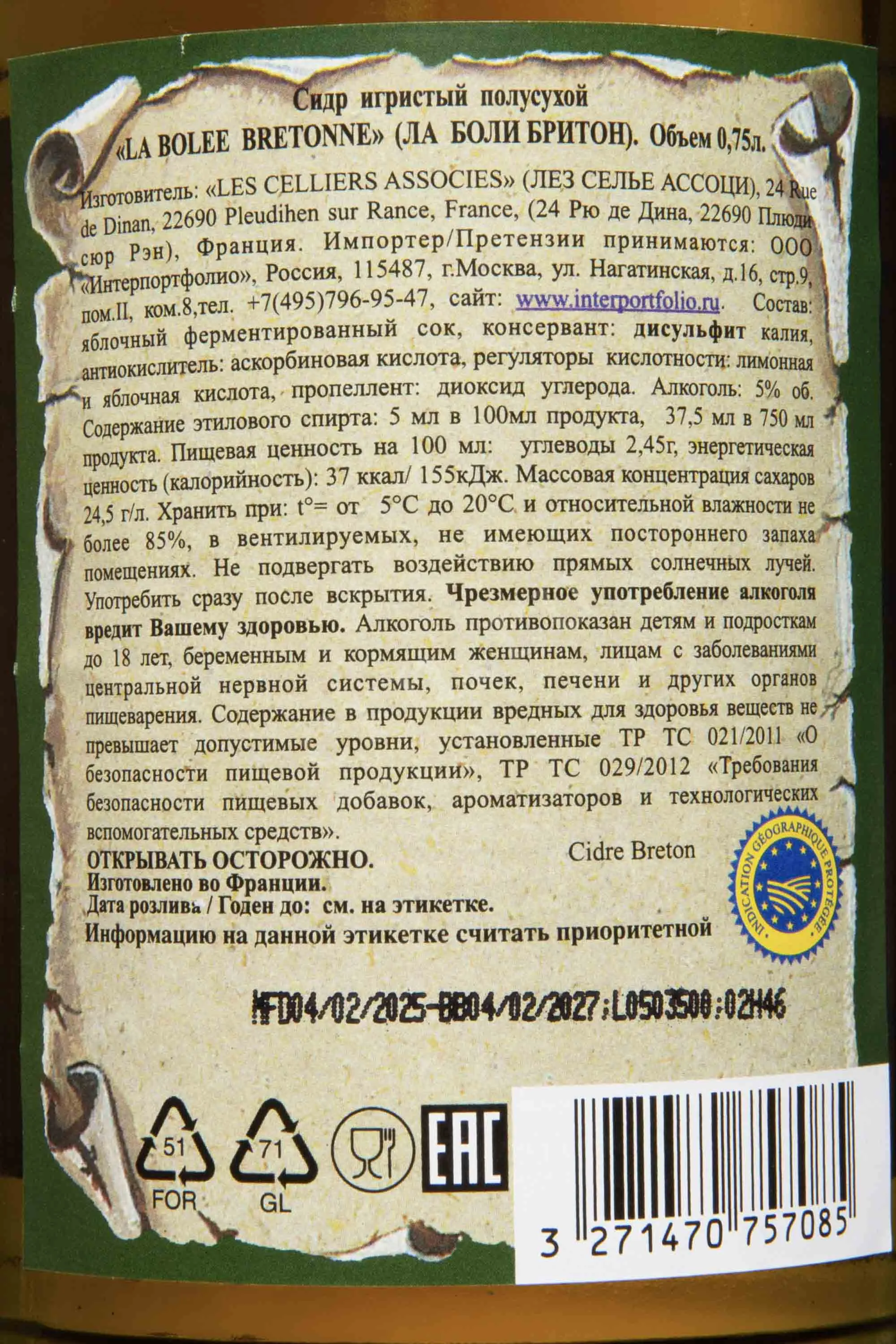 Сидр La Bolee Bretonne Brut 0,75 л — сухой образец, созданный в традициях северо-западной Франции, где сидроделие имеет многовековую историю. Напиток производится из натурального сока, полученного прямым отжимом сидровых яблок. Производство ведётся с опорой на классическую естественную ферментацию, при которой сахара почти полностью перерабатываются дрожжами, что формирует сухой стиль и умеренную кислотность напитка. В итоге получается лёгкая игристая версия с чистым и прямым характером без добавления ароматизаторов и концентратов.