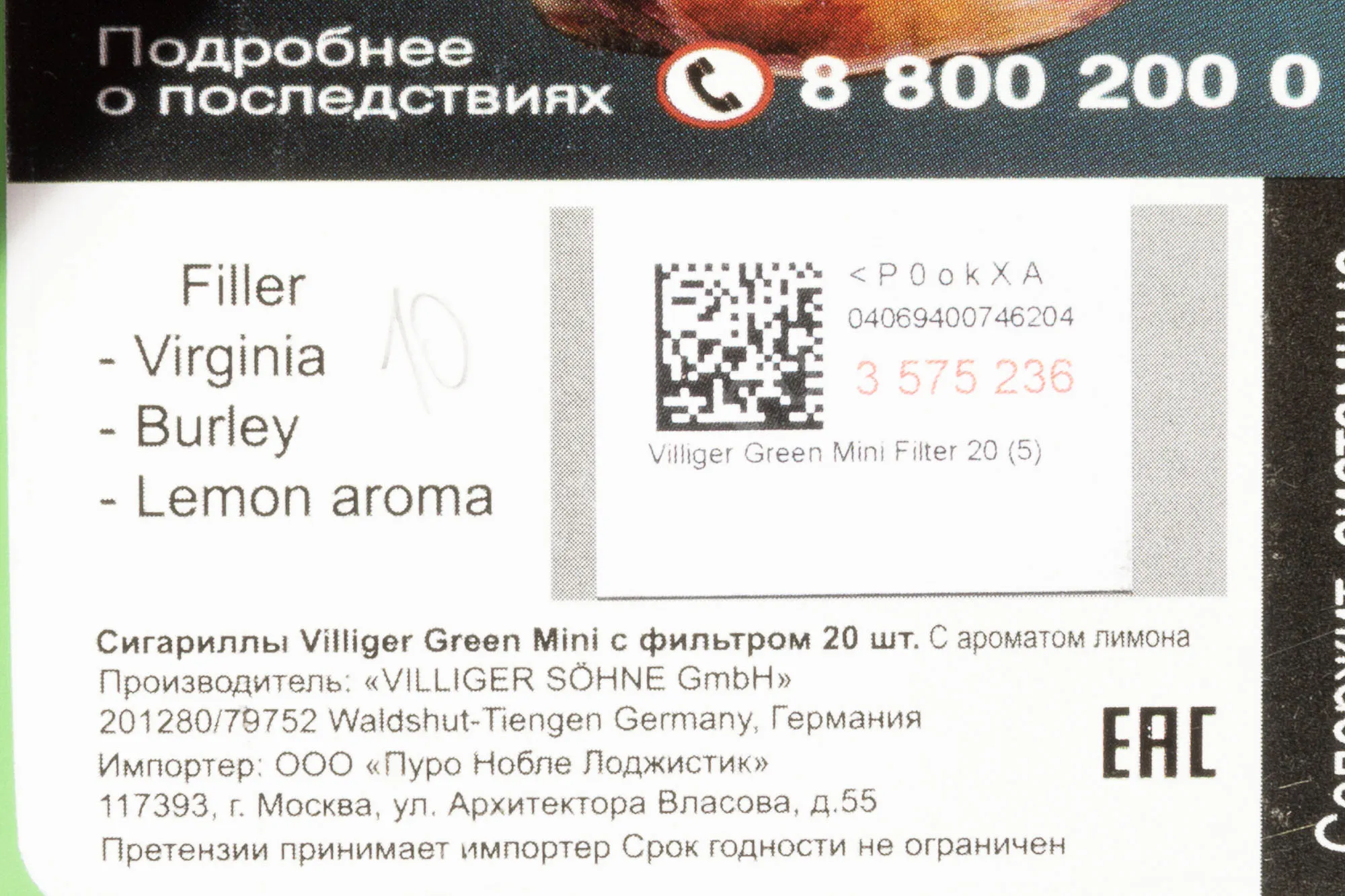 Сигариллы Villiger Green Mini Filter Lemon — ароматизированный и компактный вариант с подслащенным фильтром.