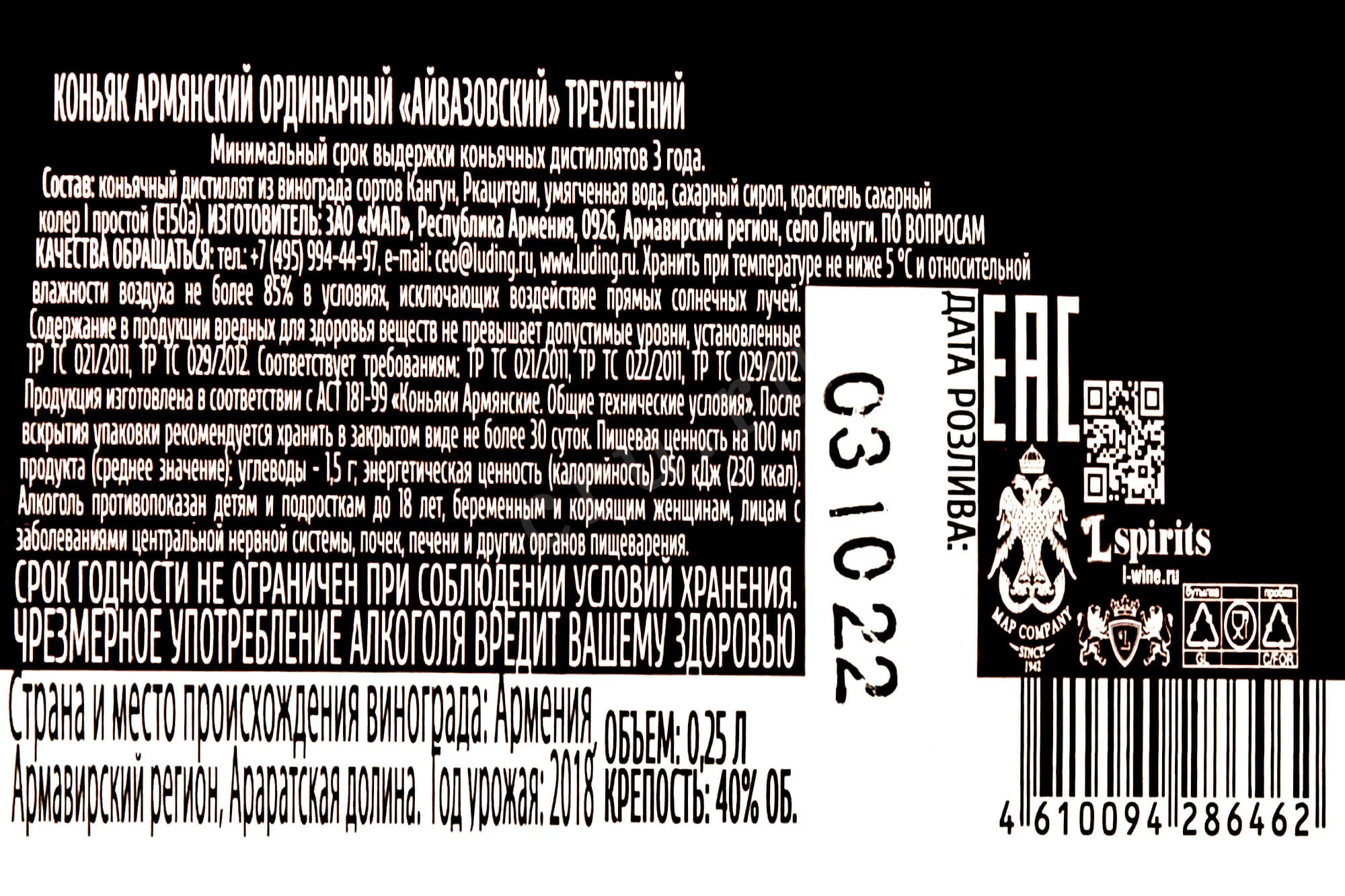 Айвазовский 3 года 0.25 л купить Армянский коньяк Aivazovsky 3 years цена в магазине КРЮ ПРОФИ