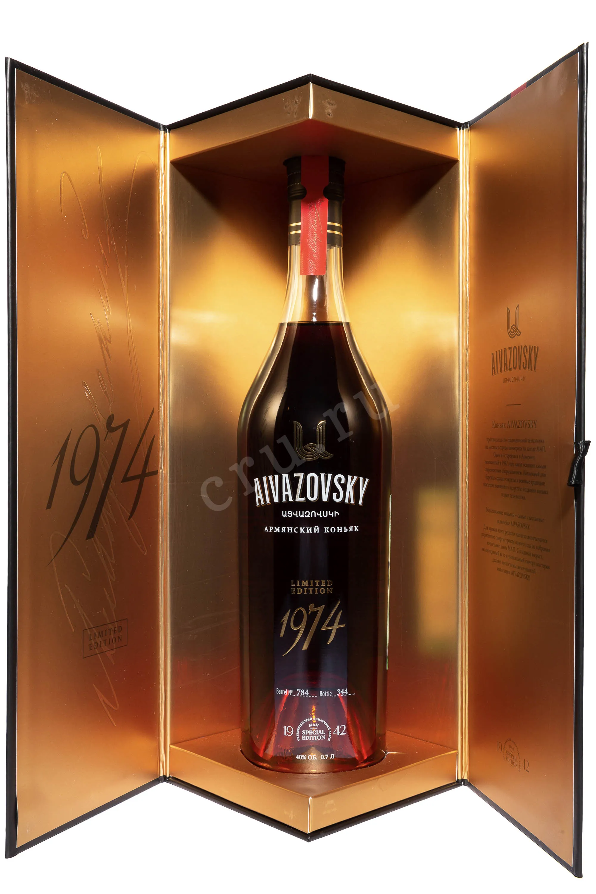 Коньяк Айвазовский Лимитированная Коллекция в подарочной упаковке 1974 0.7 л — это редкий винтажный напиток, названный в честь великого русского художника-мариниста Ивана Айвазовского. Он изготовлен из винограда автохтонных сортов Кангун и Ркацители, собранного в урожайный 1974 год. После ферментации сусло прошло двойную дистилляцию с отбором только средней фракции спиртов — самой чистой и сбалансированной части. Выдержка длилась не менее 45 лет в дубовых бочках из французского и кавказского дуба, а после купажирования напиток дополнительно отдыхал не менее трёх лет. Перед розливом коньяк фильтруется и доводится до крепости 40% родниковой водой. Каждая бутылка — часть ограниченного выпуска, представленного в роскошной подарочной коробке. Этот коньяк ценится коллекционерами и дегустаторами за гармонию вкуса и глубину аромата, часто отмечается в обзорах специалистов как пример редкого мастерства.
