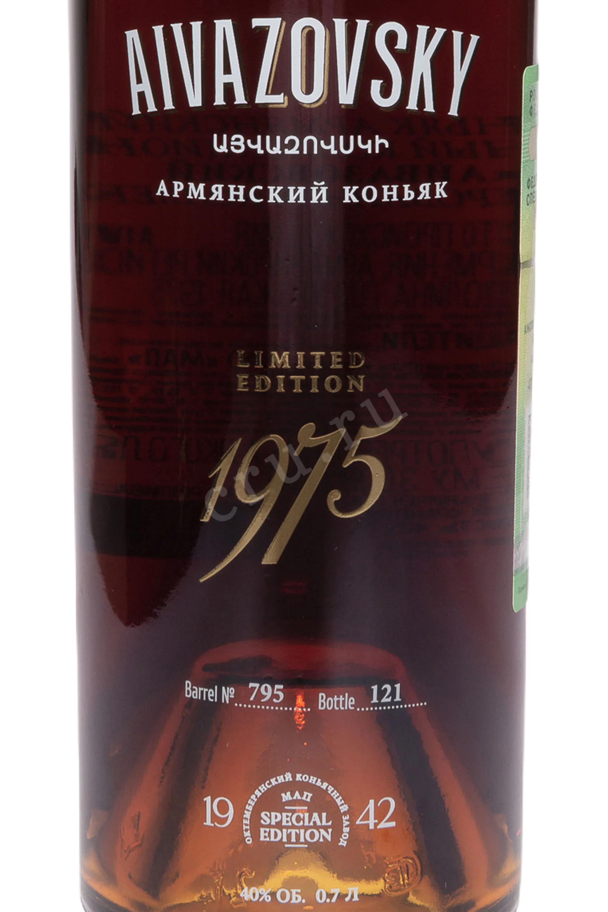 Коньяк Айвазовский Лимитированная Коллекция в подарочной упаковке 1975 0.7 л — редкий выдержанный напиток, созданный в честь великого художника-мариниста Ивана Айвазовского. Он изготовлен из отборного винограда сортов Кангун и Ркацители урожая 1975 года. Сусло подвергалось двойной перегонке с выделением только «сердца» дистиллята, что позволило сохранить чистоту вкуса. Коньяк провёл 45 лет в дубовых бочках из французского и кавказского дуба, приобретая насыщенный аромат и благородный характер. После купажирования напиток дополнительно выдерживался не менее трёх лет, а затем разбавлялся родниковой водой до 40% крепости. Этот лимитированный выпуск выпускается в изысканной подарочной коробке и ценится коллекционерами за глубину вкуса и редкость винтажа.