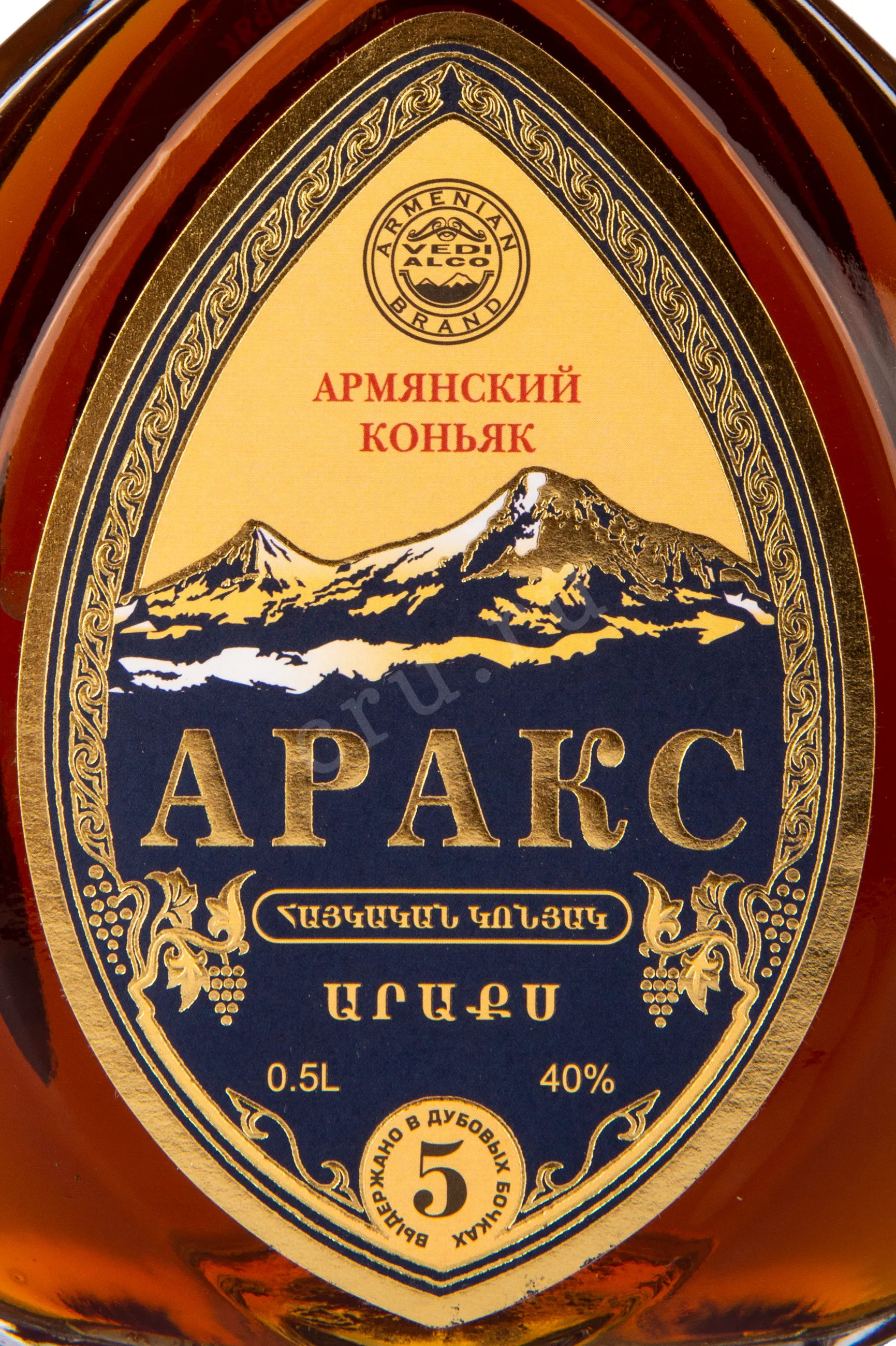 Коньяк Аракс 5 лет 0.5 л – классический армянский cognac, который производится мастерами купажа по традиционной технологии методом двойной перегонки из лучших автохтонных сортов винограда, произрастающих в Араратской долине. Бренди был назван в честь матери-реки Аракс, продолжительностью в 1072 км, это крупный правый приток Куры. Известный римский поэт Вергилий изобразил Аракс как истинный символ непокорности, свободолюбия и невероятной силы армянского народа. Купаж отборных коньячных дистиллятов высочайшего качества проходит процесс созревания в специальных дубовых бочонках в течение 3 лет, в особых подвалах компании «Веди Алко». Напиток продается в классической бутылке, станет прекрасным подарком на все случаи жизни.
